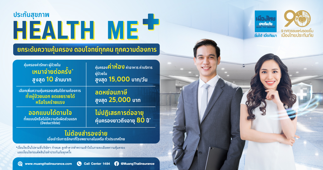 เมืองไทยประกันภัย หรือ MTI ชวนคนไทยสุขภาพดีส่งท้ายปี-ต้อนรับปีใหม่ กับประกันสุขภาพ Health ME Plus มอบความคุ้มครองระดับ VIP รักษาต่อปีแบบไม่อั้น ให้ความคุ้มครองค่ารักษาแบบผู้ป่วยในโรงพยาบาลสูงสุดถึง 10 ล้านบาทต่อครั้ง โดยไม่จำกัดจำนวนครั้งต่อปี ค่าห้องสูงสุดถึง 15,000 บาท ต่อวัน ให้ลูกค้าสามารถเลือกซื้อความคุ้มครองเสริมได้ตามต้องการจะ OPD ชดเชยรายได้ หรือ เงินก้อนจากโรคร้ายแรง ให้โปรโมชั่นผ่อน 0 % สูงสุด 6 เดือนกับบัตรเครดิตที่ร่วมรายการ และสามารถใช้ลดหย่อนภาษีได้ เพื่อมอบความคุ้มครองอย่างคุ้มค่า พร้อมจัดแผนได้ตามใจ ตอบโจทย์ผู้บริโภคทุกกลุ่ม