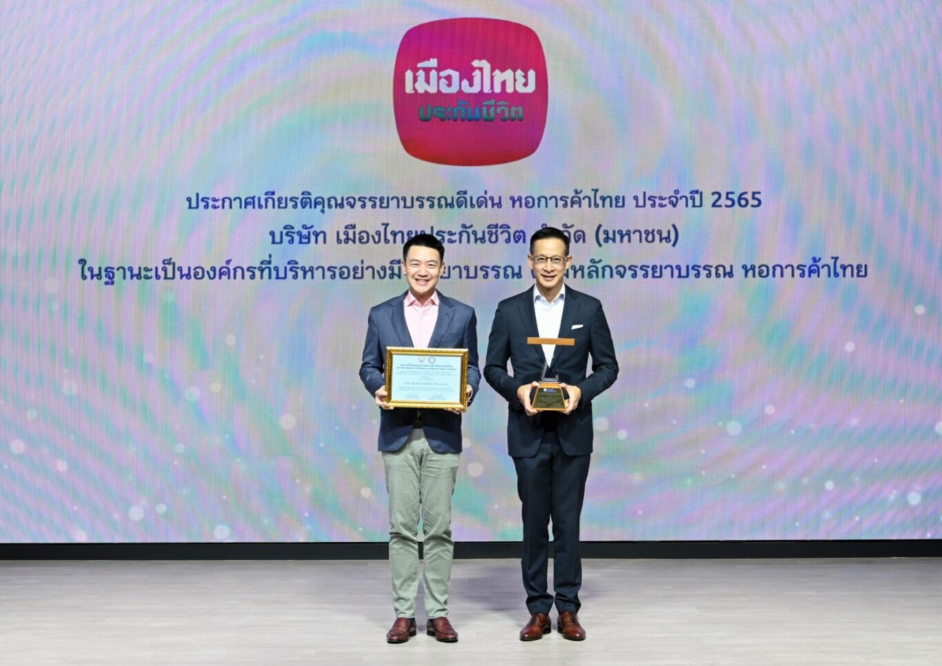 นายสาระ ล่ำซำ ประธานเจ้าหน้าที่บริหาร พร้อมด้วย ดร.สุธี  โมกขะเวส กรรมการผู้จัดการ บริษัท เมืองไทยประกันชีวิตจำกัด (มหาชน) รับรางวัลประกาศเกียรติคุณจรรยาบรรณดีเด่น หอการค้าไทย ประจำปี 2565 (TCC BEST AWARDS 2022) ในฐานะที่เป็นองค์กรที่มีการบริหารงานอย่างมีจรรยาบรรณและยึดหลักบรรษัทภิบาล (Good Corporate Governance) ควบคู่กับการให้ความสำคัญกับความยั่งยืนในระยะยาวเพื่อสร้างสมดุลทั้งในมิติเศรษฐกิจ มิติสังคม และมิติสิ่งแวดล้อม ในพิธีประกาศเกียรติคุณจรรยาบรรณดีเด่น หอการค้าไทย   ปีที่ 20 ประจำปี 2565 จัดขึ้นภายใต้แนวคิด “วิกฤตซ้อนวิกฤต พิชิตด้วยจรรยาบรรณ” ทั้งนี้ เมืองไทยประกันชีวิตเป็น 1 ใน 11 บริษัท ประเภทองค์กรขนาดใหญ่ ที่ได้รับคัดเลือกให้เข้ารับรางวัลดังกล่าว