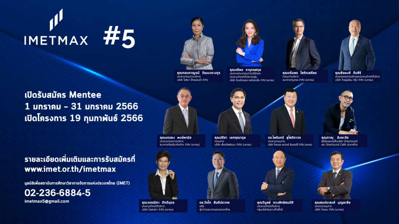 9 ม.ค. 2566 มูลนิธิเพื่อสถาบันการศึกษาวิชาการจัดการแห่งประเทศไทย (IMET) มุ่งสร้างอุทยานผู้นำ เพื่อเป็นศูนย์รวมผู้นำของชาติและเป็นศูนย์กลางการบ่มเพาะผู้นำรุ่นใหม่ให้ก้าวสู่ความเป็นผู้นำที่พร้อมทั้งความเก่งและความดี ควบคู่ไปกับการตอบแทนคุณสู่สังคมไทยได้ ผ่านโครงการ “IMET MAX” ที่รวมเหล่าผู้บริหารระดับสูงจากหลากหลายองค์กรชั้นนำของประเทศมาเป็น “เมนเทอร์” (Mentor) ถ่ายทอดประสบการณ์อันมีค่าที่สะสมมายาวนาน ตลอดทั้งให้คำชี้แนะ ให้คำปรึกษา ให้มุมมองสะท้อนย้อนคิด (Reflection) และสร้างแรงบันดาลใจให้กับ “เมนที” (Mentee) ซึ่งเป็นผู้นำรุ่นใหม่ที่มีศักยภาพสูงของสังคม โดยล่าสุด พร้อมเดินหน้าสู่ปีที่ 5 “IMET MAX 5” ดึง 12 ผู้บริหารชั้นนำระดับประเทศร่วมเป็นเมนเทอร์ (Mentor)