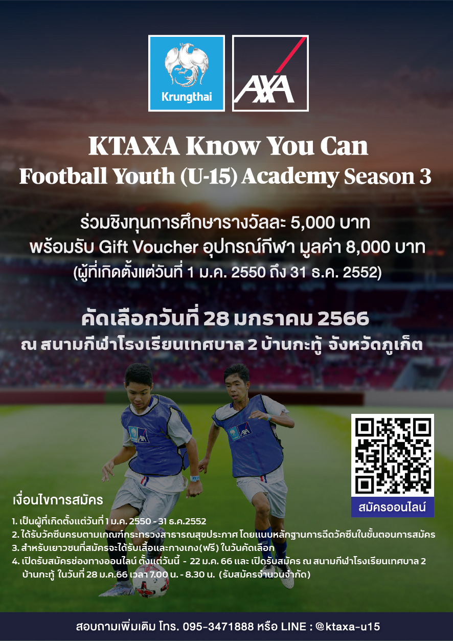 บมจ.กรุงไทย-แอกซ่า ประกันชีวิต ขอเชิญชวนเยาวชนไทยอายุระหว่าง 13-15 ปี ที่มีใจรักในกีฬาฟุตบอล เข้าร่วมโครงการ “KTAXA Know You Can Football Youth (U-15) Academy ปีที่ 3 (สนามภาคใต้)” เพื่อชิงทุนการศึกษา รางวัลละ 5,000 บาท และ Gift Voucher อุปกรณ์กีฬา มูลค่า 8,000 บาท โดยกิจกรรมจะจัดขึ้นในวันที่ 28 มกราคม 2566 ณ สนามกีฬาโรงเรียนเทศบาล 2 บ้านกะทู้ จังหวัดภูเก็ต โดยโครงการดังกล่าวเป็นส่วนหนึ่งในการยกระดับทักษะฟุตบอลเยาวชนไทยสู่มาตราฐานสากล และสร้างความตระหนักรู้ถึงความสำคัญของการมีสุขภาพที่ดีผ่านการออกกำลังกาย อีกทั้งบริษัทฯ ยังคงพร้อมจะอยู่เคียงข้างทุกความเชื่อมั่นของเยาวชนไทย และมอบโอกาสในการพัฒนาทักษะเพื่อสามารถก้าวเดินตามความฝันได้สำเร็จ
