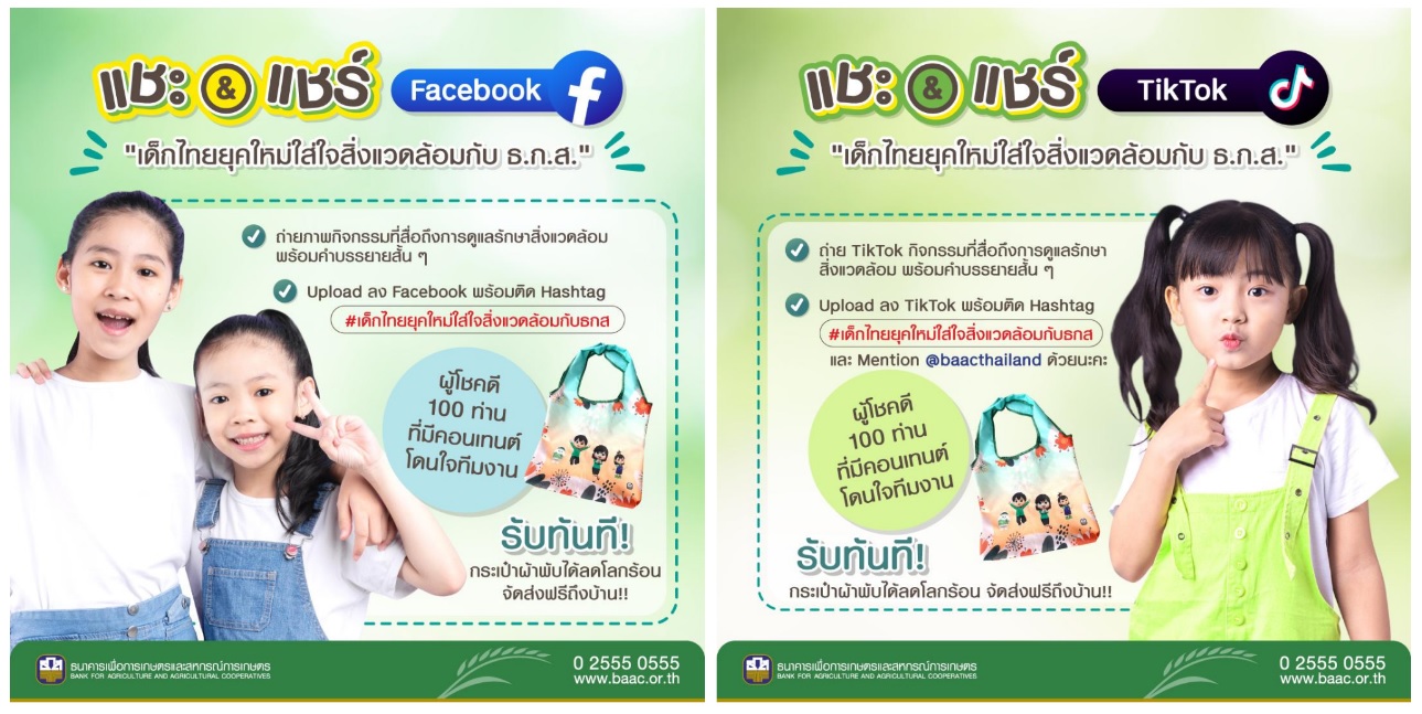 โอกาสนี้ ธ.ก.ส. ขอเชิญชวนเด็กและเยาวชนร่วมกิจกรรมวันเด็กออนไลน์ในคอนเซปต์ “เด็กไทยยุคใหม่ใส่ใจสิ่งแวดล้อมกับ ธ.ก.ส.” เพียงเด็ก ๆ ถ่ายภาพกิจกรรมในการดูแลสิ่งแวดล้อมและใส่คำบรรยาย (caption) ที่สื่อถึงการใส่ใจสิ่งแวดล้อม พร้อม mention @ธกส BAAC Thailand และติดแฮชแท็ก #เด็กไทยยุคใหม่ใส่ใจสิ่งแวดล้อมกับธกส ผู้ร่วมสนุก 200 คนแรก รับเลย ! กระเป๋าผ้าพับได้ลดโลกร้อนจัดส่งฟรีถึงหน้าบ้านคุณ ร่วมสนุกได้แล้วตั้งแต่วันนี้จนถึงวันที่ 14 มกราคม 2566 ผ่านทางแอปพลิเคชัน Facebook และ TikTok