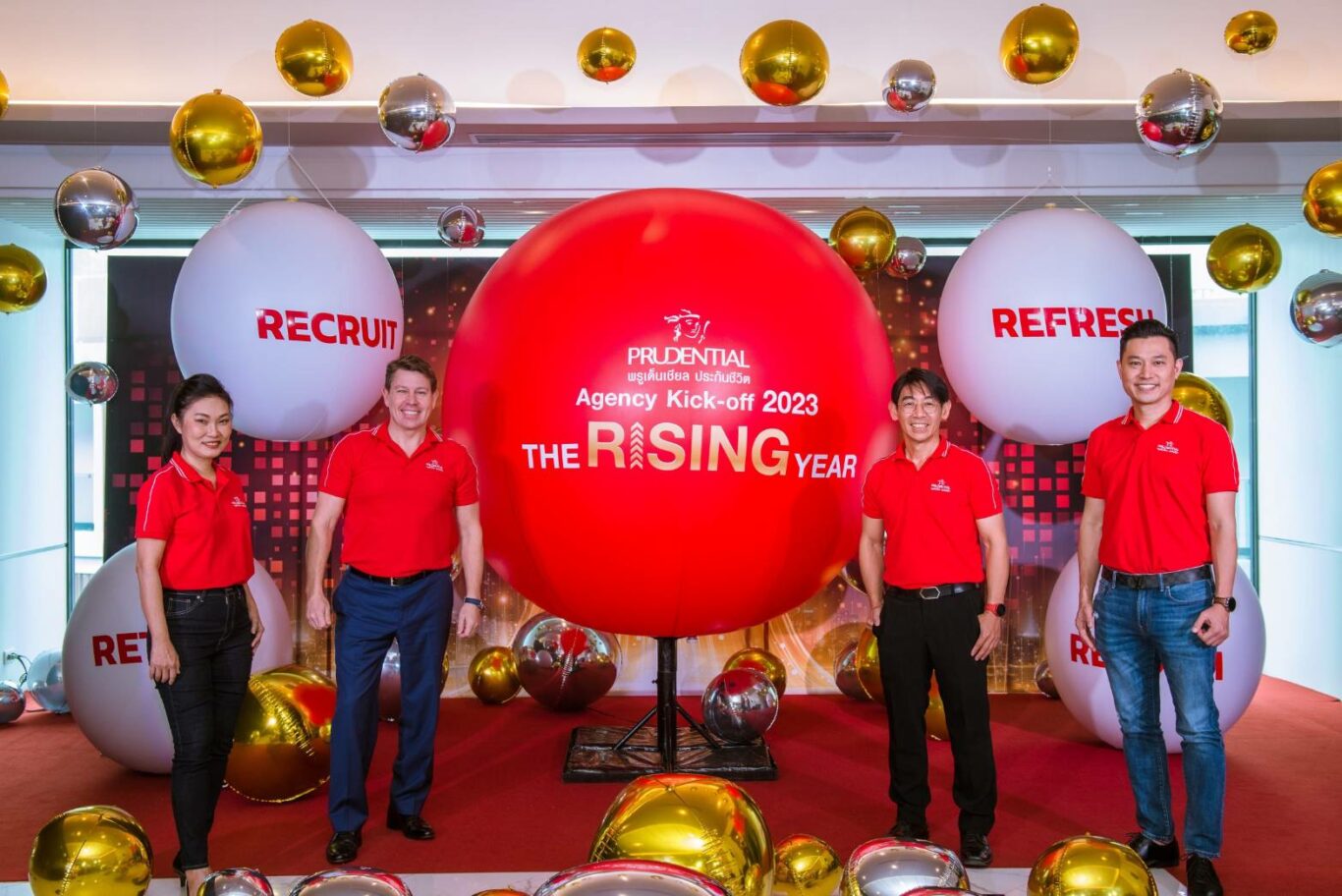 นายบัณฑิต เจียมอนุกูลกิจ (ที่ 2 จากขวา) ประธานเจ้าหน้าที่บริหาร พรูเด็นเชียล ประเทศไทย พร้อมคณะผู้บริหาร จัดงาน “Agency Kick Off 2023 – The Rising Year” เพื่อร่วมเฉลิมฉลองปีแห่งความก้าวหน้า และประกาศแนวทางขับเคลื่อนเป้าหมายด้านตัวแทน