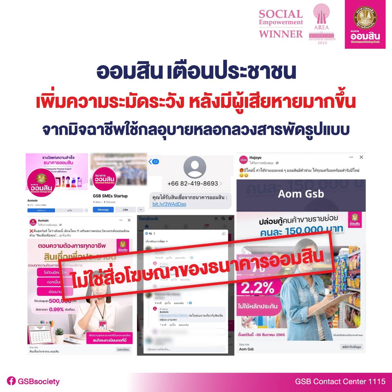 รายงานข่าวจากธนาคารออมสิน แจ้งว่า ขณะนี้ได้มีกลุ่มมิจฉาชีพใช้กลอุบายหลากหลายสารพัดรูปแบบหลอกลวงประชาชนทำให้มีผู้เสียหายเพิ่มมากขึ้น ทั้งการส่งข้อความเข้าโทรศัพท์มือถือล่อลวงว่าได้รับวงเงินฟรีโดยให้กดลิงก์เพื่อดูดข้อมูลและเงินในบัญชี หรือ การแอบอ้างชื่อและโลโก้ของธนาคารทำโฆษณาหลอกลวงบนโซเชียลมีเดีย หากหลงเชื่อลงทะเบียนผ่านช่องทางต่าง ๆ ไม่ว่าจะเป็น Facebook Line ทางโทรศัพท์มือถือ ทั้งที่เป็นส่งมาทางข้อความหรือแก๊งคอลเซ็นเตอร์โทร.เข้า ประชาชนจะสูญเสียเงินแบบไม่ทันตั้งตัว โดยที่ธนาคารหรือหน่วยงานรัฐไม่อาจช่วยเหลือป้องกันใด ๆ ได้ทัน