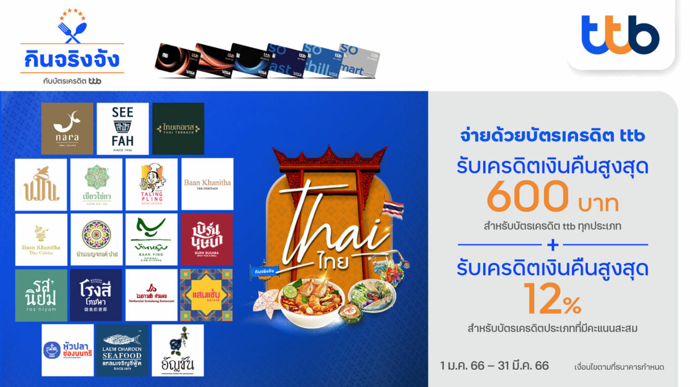 บัตรเครดิต ทีทีบี ร่วมกับ ร้านอาหารไทยชื่อดัง จัดรายการ “Thai ไทย” มอบส่วนลดและเครดิตเงินคืนให้กับผู้ใช้บริการ ถึง 3 สิทธิพิเศษด้วยกัน เมื่อรับประทานอาหารที่ร้านหรือสั่งกลับบ้าน และชำระค่าใช้จ่ายด้วยบัตรเครดิต ทีทีบี ทุกประเภท ระหว่างวันที่ 1 มกราคม – 31 มีนาคม 2566 ดังนี้
