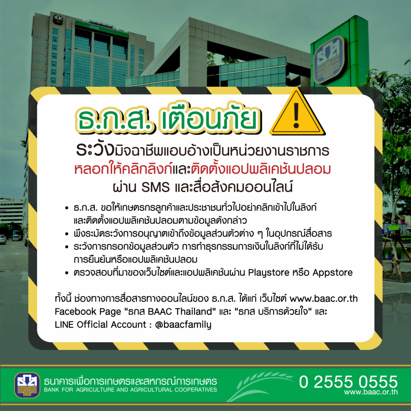 ธ.ก.ส. เตือนภัย! ระวังมิจฉาชีพแอบอ้างเป็นหน่วยงานราชการส่งลิงก์ให้คลิกและติดตั้งแอปพลิเคชันปลอมที่แฝงมากับมัลแวร์ ผ่านทาง SMS และสื่อสังคมออนไลน์ ซึ่งเปิดโอกาสให้มิจฉาชีพสามารถควบคุมโทรศัพท์และทำการโอนเงินออกจากบัญชีธนาคาร จึงควรใช้ความระมัดระวังในการติดต่อหรือทำธุรกรรมออนไลน์
