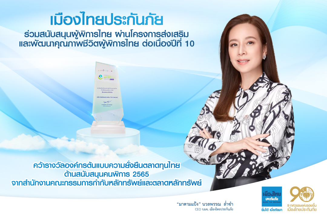 ปี 2565 เมืองไทยประกันภัย ได้รับรางวัลองค์กรต้นแบบความยั่งยืนตลาดทุนไทย ด้านสนับสนุนคนพิการ จากสำนักงานคณะกรรมการกำกับหลักทรัพย์และตลาดหลักทรัพย์ (ก.ล.ต.) เราให้ความสำคัญกับนโยบายความรับผิดชอบต่อสังคม เพื่อการพัฒนาองค์กรอย่างยั่งยืน และพร้อมเป็นส่วนหนึ่งของการสร้างโอกาสและความเสมอภาคในสังคมให้แก่ผู้พิการ เพื่อให้ได้มีคุณภาพชีวิตที่ดียิ่งขึ้น สามารถดำเนินอยู่ในสังคมไทยได้อย่างมีความสุข ยิ้มได้ เมื่อภัยมา