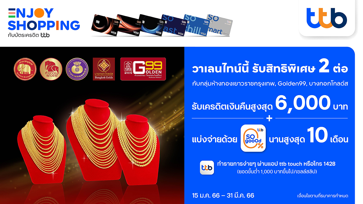 บัตรเครดิต ทีทีบี ร่วมกับ กลุ่มห้างทองเยาวราชกรุงเทพ (ห้างทองเยาวราชกรุงเทพ, ห้างทองเยาวราช, ห้างทองเยาวราชออมทอง) ห้างทอง Golden99 และ ห้างทองบางกอกโกลด์ส ร่วมฉลองวาเลนไทน์นี้ ด้วยสิทธิพิเศษ 2 ต่อ เมื่อซื้อทองด้วยบัตรเครดิต ทีทีบี ทุกประเภท ตั้งแต่วันนี้ ถึง 31 มีนาคม 2566 ดังนี้