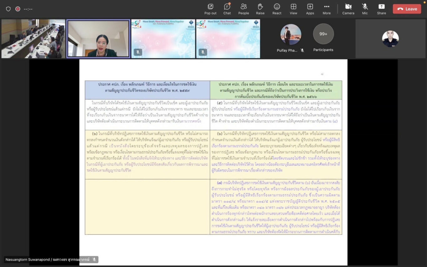 ดร.สุทธิพล ทวีชัยการ เลขาธิการคณะกรรมการกำกับและส่งเสริมการประกอบธุรกิจประกันภัย (เลขาธิการ คปภ.) เป็นประธานเปิดการประชุมเพื่อเสริมสร้างความรู้ ความเข้าใจเกี่ยวกับแนวทางในการปฏิบัติตาม “ประกาศ คปภ. เรื่อง หลักเกณฑ์ วิธีการ เงื่อนไข และระยะเวลาในการชดใช้เงินหรือค่าสินไหมทดแทนตามสัญญาประกันภัย และกรณีที่ถือว่าเป็นการประวิงการจ่ายค่าสินไหมทดแทน หรือประวิงการคืนเบี้ยประกันภัยของบริษัทประกันภัย” เมื่อวันที่ 8 กุมภาพันธ์ 2566โดยประชุมผ่านจอภาพ (ระบบ Microsoft Teams) โดยมีวัตถุประสงค์เพื่อเสริมสร้างความรู้ ความเข้าใจ ให้ภาคธุรกิจหรือบริษัทประกันภัย สามารถปฏิบัติตามกฎหมายได้อย่างถูกต้อง รวมทั้งเพื่อให้พนักงานเจ้าหน้าที่ของสำนักงาน คปภ. ที่ต้องปฏิบัติหน้าที่ในการกำกับดูแลบริษัทประกันภัยให้ปฏิบัติตามกฎหมาย ทั้งในส่วนกลาง และส่วนภูมิภาค ได้รับทราบข้อกำหนดตามประกาศฯ ที่ได้มีการปรับปรุงแก้ไขใหม่นี้ รวมทั้งเป็นโอกาสอันดีในการแลกเปลี่ยนประสบการณ์ ตลอดจนได้ซักถามข้อสงสัยในทางปฏิบัติ เพื่อให้ทุกฝ่ายที่เกี่ยวข้องสามารถปฏิบัติตามกฎหมายไปในแนวทางเดียวกัน อันจะเป็นการคุ้มครองสิทธิของผู้เอาประกันภัย และประชาชน ให้ได้รับความคุ้มครองตามเงื่อนไขในกรมธรรม์ประกันภัยอย่างถูกต้องและเป็นธรรม