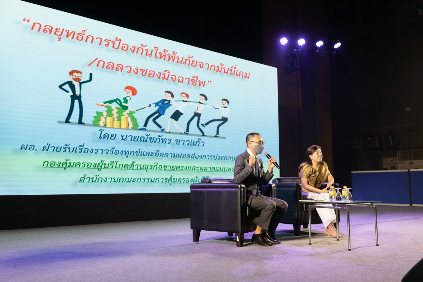 ภายในงานยังได้รับเกียรติจาก นายธสรณ์อัฑฒ์ ธนิทธิพันธ์ เลขาธิการคณะกรรมการคุ้มครองผู้บริโภค (สคบ.) ร่วมปาฐกถาแนวทางการทำงาน สคบ. ปี 2023 และให้ความรู้ป้องกันภัยจากแชร์ลูกโซ่รวมถึง นางสาวดาลัด รยะสวัสดิ์ ผู้อำนวยการฝ่ายเผยแพร่วิชาการและพัฒนาเครือข่ายคุ้มครองผู้บริโภค และ นายณัชภัทร ขาวแก้ว ผู้อำนวยการฝ่ายรับเรื่องร้องทุกข์กองคุ้มครองผู้บริโภคด้านธุรกิจขายตรง เสวนาพิเศษภายใต้หัวข้อ “สคบ. กับนโยบายส่งเสริมสนับสนุนอุตสาหกรรมขายตรง และกลยุทธ์การป้องกันประชาชนจากภัยมันนี่เกม”