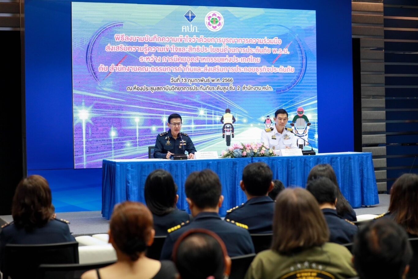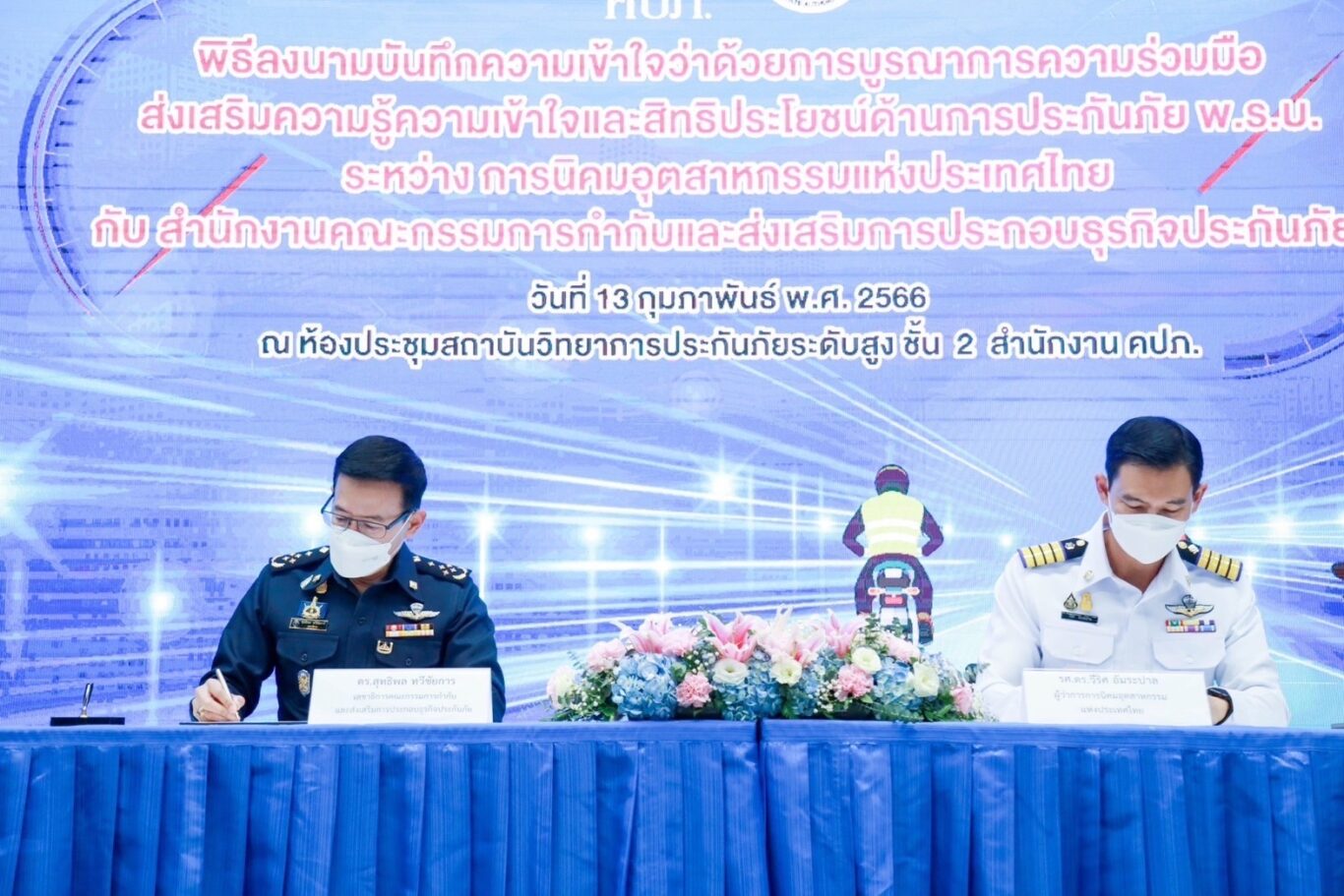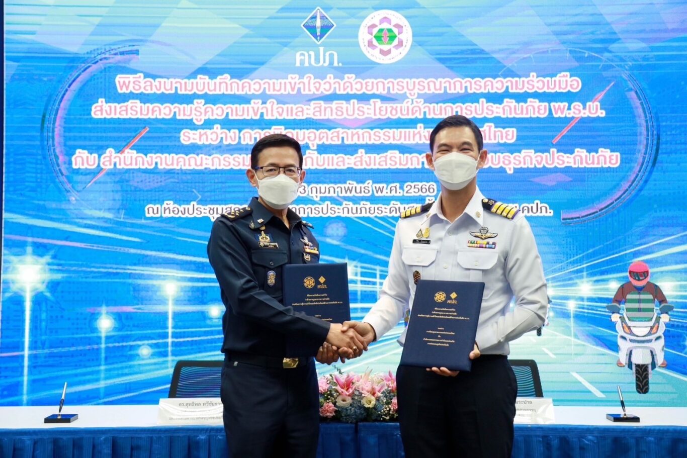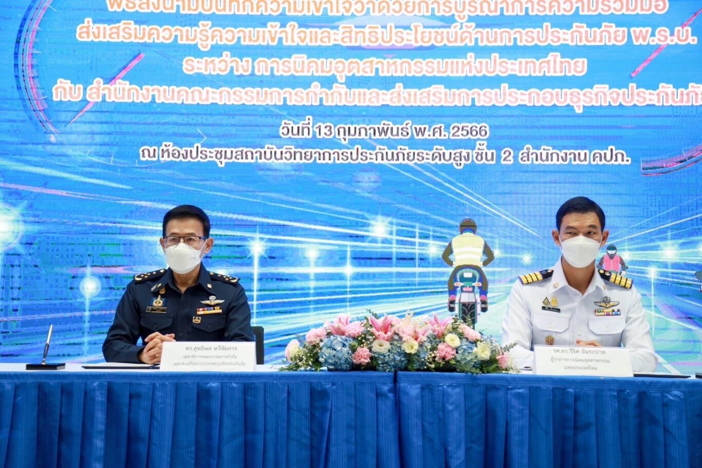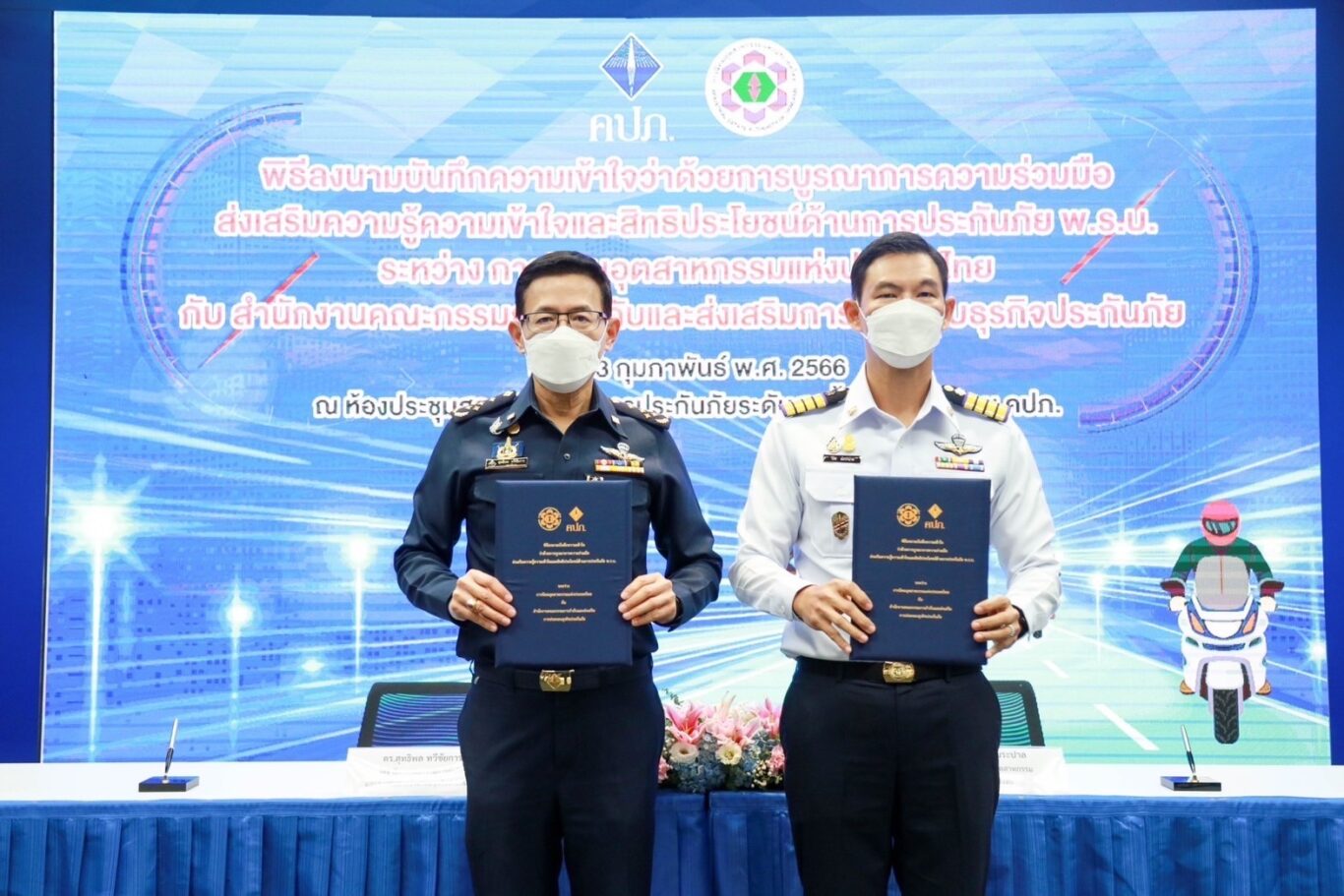 เมื่อวันที่ 13 กุมภาพันธ์ 2566 ดร.สุทธิพล ทวีชัยการ เลขาธิการคณะกรรมการกำกับและส่งเสริมการประกอบธุรกิจประกันภัย (เลขาธิการ คปภ.) พร้อมด้วย รศ.ดร.วีริศ อัมระปาล ผู้ว่าการการนิคมอุตสาหกรรมแห่งประเทศไทย (ผู้ว่าการ กนอ.) ร่วมลงนามในบันทึกความเข้าใจว่าด้วยการบูรณาการความร่วมมือส่งเสริมความรู้ ความเข้าใจ และสิทธิประโยชน์ ด้านการประกันภัย พ.ร.บ. ระหว่าง สำนักงานคณะกรรมการกำกับและส่งเสริมการประกอบธุรกิจประกันภัย (สำนักงาน คปภ.) กับ การนิคมอุตสาหกรรมแห่งประเทศไทย (กนอ.) โดยมีนายนรินทร์ กัลยาณมิตร ประธานกรรมการการนิคมอุตสาหกรรมแห่งประเทศไทย และบอร์ดกองทุนทดแทนผู้ประสบภัย นายภาณุ จันทร์เจียวใช้ บอร์ดกองทุนทดแทนผู้ประสบภัย ตลอดจนคณะผู้บริหารของทั้งสองหน่วยงาน และสื่อมวลชนร่วมเป็นสักขีพยาน ณ ห้องประชุมสถาบันวิทยาการประกันภัยระดับสูง ชั้น 2 สำนักงาน คปภ. ถนนรัชดาภิเษก กรุงเทพฯ