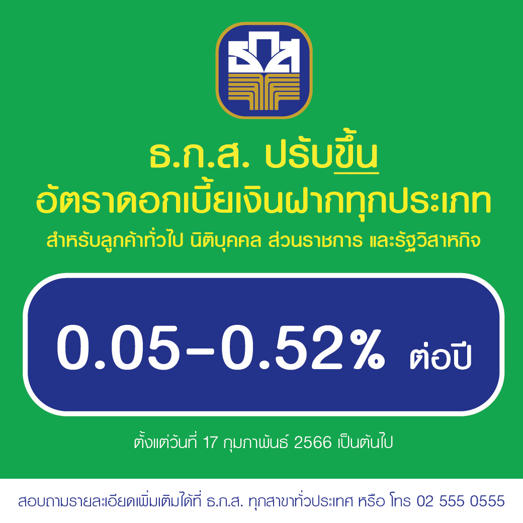 ธ.ก.ส. ประกาศปรับขึ้นอัตราดอกเบี้ยเงินฝากออมทรัพย์และเงินฝากประจำสูงสุดร้อยละ 0.52 ต่อปี สอดรับกับทิศทางอัตราดอกเบี้ยนโยบายและสนับสนุนการออมให้ลูกค้าได้รับผลตอบแทนที่เพิ่มขึ้น เพื่อช่วยเพิ่มกำลังซื้อ ลดภาระจากค่าครองชีพที่สูงขึ้น ตามการฟื้นตัวของเศรษฐกิจ โดยมีผลตั้งแต่วันที่ 17 กุมภาพันธ์ 2566 เป็นต้นไป