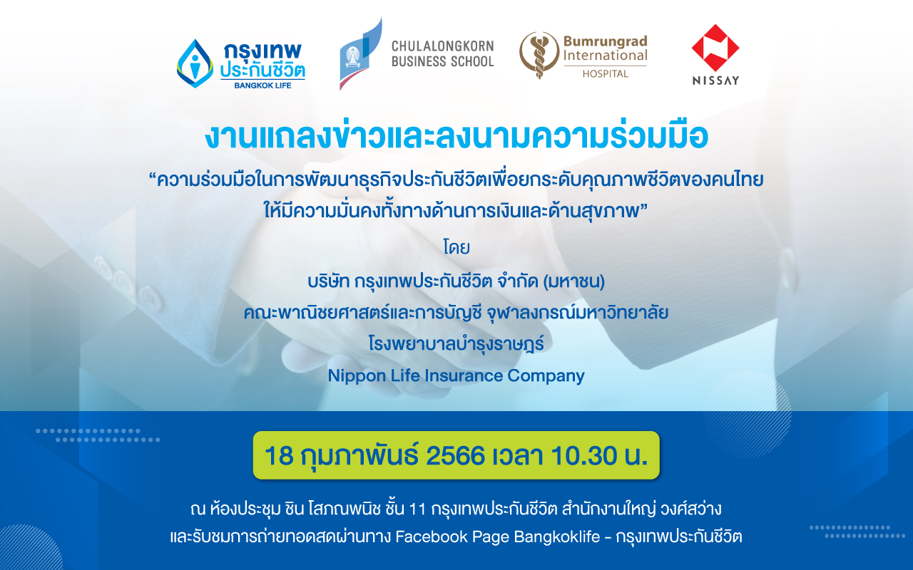กรุงเทพประกันชีวิต ผนึกกำลังความร่วมมือกับองค์กรพันธมิตรระดับประเทศ มุ่งยกระดับคุณภาพชีวิตคนไทย ในงานแถลงข่าวและลงนาม “ความร่วมมือในการพัฒนาธุรกิจประกันชีวิตเพื่อยกระดับคุณภาพชีวิตของคนไทย ให้มีความมั่นคงทั้งทางด้านการเงินและด้านสุขภาพ” โดย นายโชน โสภณพนิช กรรมการผู้จัดการใหญ่และประธานเจ้าหน้าที่บริหาร บริษัท กรุงเทพประกันชีวิต จำกัด (มหาชน) รศ. ดร.วิเลิศ ภูริวัชร คณบดี คณะพาณิชยศาสตร์และการบัญชี จุฬาลงกรณ์มหาวิทยาลัย นาวาโทนายแพทย์สราวุฒิ เนียมลอย Head of Insurance & Medical Assistance โรงพยาบาลบำรุงราษฎร์ และ นายยูอิชิ ฮอนด้า ผู้แทนประจำประเทศไทย บริษัท นิปปอนไลฟ์ อินชัวรันส์ จำกัด ร่วมลงนาม