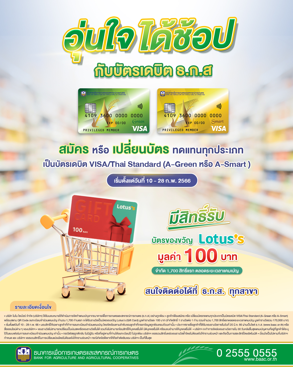 ธนาคารเพื่อการเกษตรและสหกรณ์การเกษตร (ธ.ก.ส.) จัดแคมเปญอุ่นใจได้ช้อป สำหรับลูกค้าที่สมัครหรือเปลี่ยนบัตรทดแทนทุกประเภท เป็นบัตรเดบิต A-Green หรือ A-Smart แล้วแสกน QR Code ลงทะเบียนเข้าร่วมแคมเปญ ณ ธ.ก.ส. สาขาที่ทำธุรกรรม รับเลย ! บัตรของขวัญ Lotus’s มูลค่า 100 บาท จำนวน 1,700 รางวัล มูลค่ารวม 170,000 บาท (จำกัดสิทธิ์ 1 ท่านต่อ 1 รางวัล สำหรับ 1,700 ท่านแรก) โดย ธ.ก.ส. จะทำการตรวจสอบสิทธิ์และประกาศผลรายชื่อผู้ที่ได้รับรางวัลผ่านทาง www.baac.or.th หรือ Facebook page: ธกส บริการด้วยใจ และจัดส่งของรางวัลภายใน 30 วันหลังสิ้นสุดแคมเปญ ลงทะเบียนเข้าร่วมแคมเปญได้ตั้งแต่บัดนี้จนถึง 28 กุมภาพันธ์ 2566