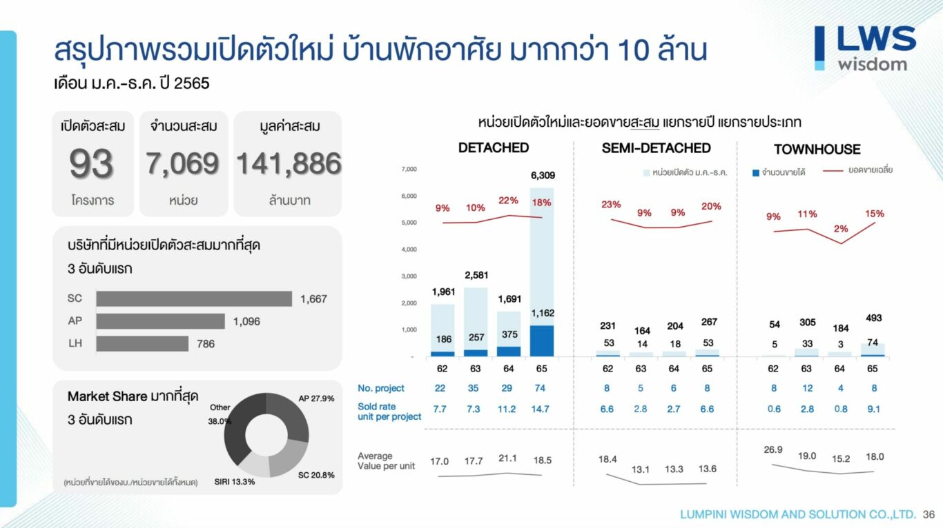 นายประพันธ์ศักดิ์ รักษ์ไชยวรรณ กรรมการผู้จัดการ บริษัท ลุมพินี วิสดอม แอนด์ โซลูชั่น จำกัด บริษัทวิจัยและพัฒนาอสังหาริมทรัพย์ในเครือบริษัท แอล.พี. เอ็น. ดีเวลลอปเมนท์ จำกัด (มหาชน) ระบุว่า ปัจจุบันความต้องการบ้านพักอาศัยที่ระดับราคาเกิน 10 ล้านบาท มีอัตราการเติบโตอย่างต่อเนื่อง โดยในปี 2565 มีการเปิดตัวโครงการบ้านพักอาศัยระดับราคาเกิน 10 ล้านบาทในเขตกรุงเทพฯ-ปริมณฑล ทั้งสิ้น 93 โครงการ จำนวน 7,077 หน่วย คิดเป็นสัดส่วน 13.7% ของจำนวนหน่วยเปิดตัวโครงการใหม่ ของบ้านพักอาศัยทั้งหมดในเขตกรุงเทพฯ-ปริมณฑล จำนวน 51,660 หน่วย หรือคิดเป็นมูลค่าประมาณ 141,886 ล้านบาท คิดเป็นสัดส่วน 44% ของมูลค่าการเปิดตัวโครงการเปิดตัวใหม่ของโครงการบ้านพักอาศัยทั้งหมด 322,308 ล้านบาท มีอัตราการขายเฉลี่ย ณ วันเปิดตัวโครงการเฉลี่ยที่ 30%