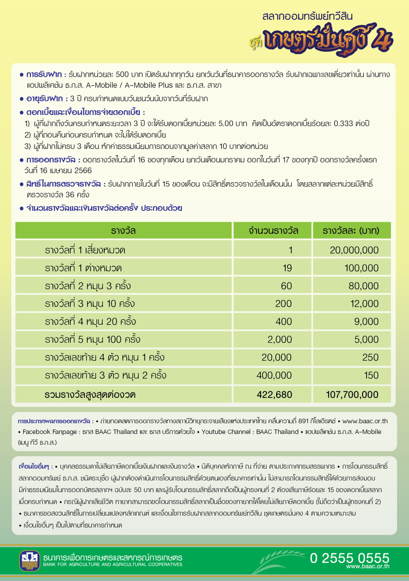 ธ.ก.ส. เปิดรับฝาก “สลากออมทรัพย์ทวีสิน ชุดเกษตรมั่นคง 4” หน่วยละ 500 บาท จำนวน 200 ล้านหน่วย วงเงินรวม 100,000 ล้านบาท ฝากครบ 3 ปี ได้รับดอกเบี้ยหน่วยละ 5 บาท พร้อมลุ้นรางวัลใหญ่ 20 ล้านบาท และรางวัลอื่น ๆ รวมมูลค่า 107 ล้านบาทต่อเดือน เปิดรับฝาก 2 ช่วง ช่วงที่ 1 ระหว่างวันที่ 20 – 23 มีนาคม 2566 วงเงินรวม 70,000 ล้านบาท และช่วงที่ 2 ตั้งแต่วันที่ 24 มีนาคม 2566 เป็นต้นไป วงเงินรวม 30,000 ล้านบาท ผ่านแอปพลิเคชัน ธ.ก.ส. A-Mobile หรือ A-Mobile Plus และ ธ.ก.ส. ทุกสาขาทั่วประเทศ พิเศษ ! สำหรับเกษตรกรลูกค้าและลูกค้าผู้ฝากสลากออมทรัพย์ทวีสิน 3 ที่ครบกำหนดไถ่ถอน สามารถใช้สิทธิ์จองสลากได้ก่อนใครผ่านระบบ ธ.ก.ส. ในวันที่ 13 – 18 มีนาคม 2566