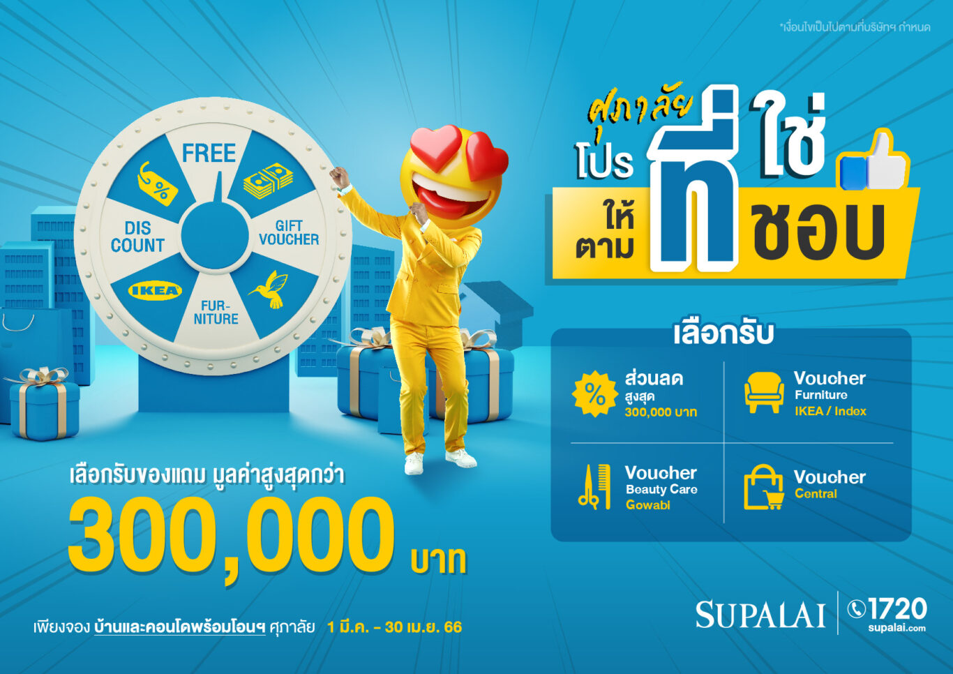 ศุภาลัย ไม่รอช้าจัดหนักส่งโปรโมชันแรงเอาใจคนอยากมีบ้านและคอนโดฯ กับ “ศุภาลัย โปรที่ใช่ ให้ตามที่ชอบ” เอาใจคนชอบความคุ้มค่า จัดหนักส่วนลดบ้านหรือคอนโดฯสูงสุดถึง 300,000 บาท* ส่วนสายช้อปไม่ต้องน้อยใจ เพราะสามารถเลือก Voucher Central, IKEA, INDEX ช้อปเฟอร์นิเจอร์ หรือของใช้ต่างๆเข้าบ้านแบบฟินๆ หรือเลือก Voucher Gowabi ไปดูแลสุขภาพและความงาม มูลค่าสูงสุด 150,000 บาท* (*เงื่อนไขเป็นไปตามที่บริษัทฯ กำหนด) พร้อมฟรี! ของแถมทั้งค่าธรรมเนียมโอนกรรมสิทธิ์, ค่าส่วนกลาง 1 ปีแรก, ค่ามิเตอร์น้ำ ค่ามิเตอร์ไฟ และกู้ไม่ผ่านยินดีคืนเงิน ตามใจขนาดนี้ต้องที่ศุภาลัยเท่านั้น! เริ่มตั้งแต่วันที่ 1 มีนาคม – 30 เมษายนนี้