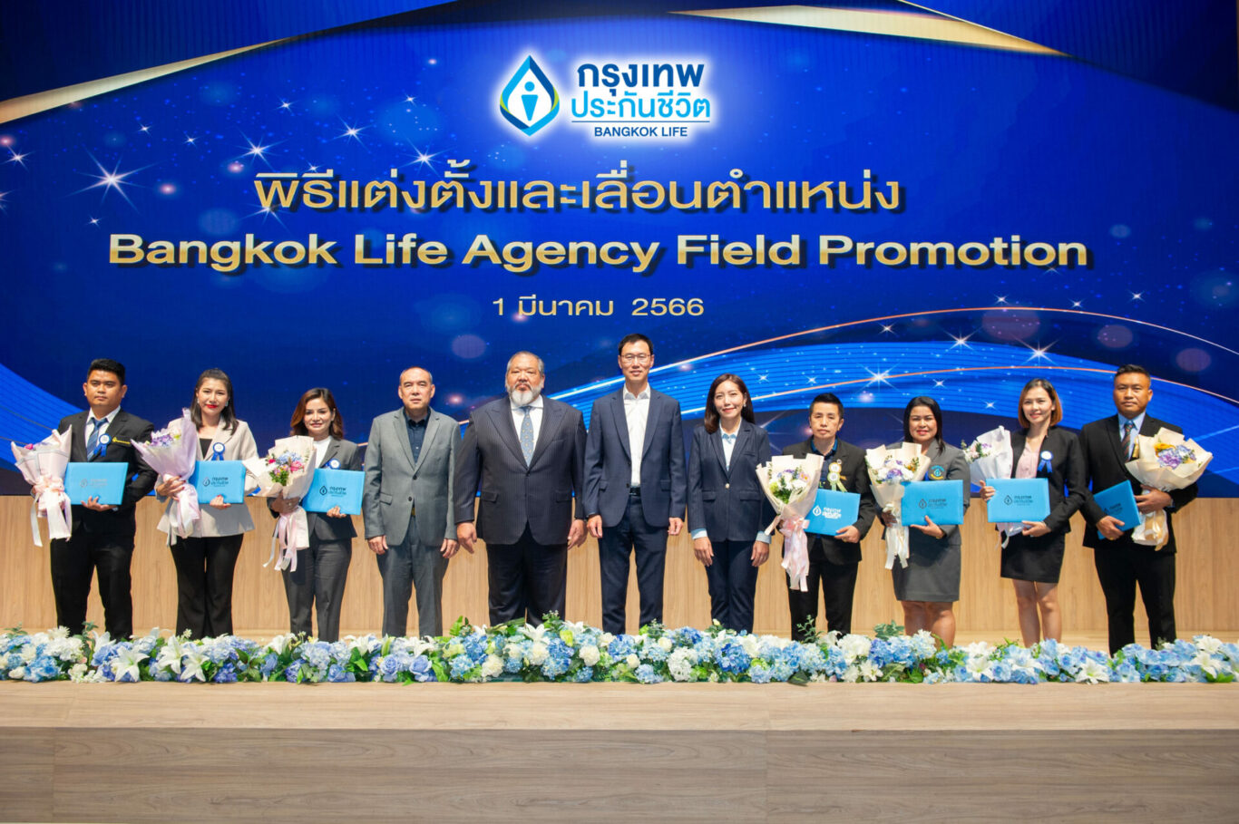 บริษัท กรุงเทพประกันชีวิต จำกัด (มหาชน) จัดพิธีแต่งตั้งและเลื่อนตำแหน่งผู้บริหารฝ่ายขาย ประจำปี 2566 Bangkok Life Agency Field Promotion โดยมี นายโชน โสภณพนิช (กลาง) กรรมการผู้จัดการใหญ่และประธานเจ้าหน้าที่บริหาร นายอนุชา ภิงคารวัฒน์ (ที่ 5 จากซ้าย) ผู้ช่วยผู้จัดการใหญ่สายงานตัวแทนและที่ปรึกษาทางการเงิน นายปรัชญ์ สิงหเสนี (ที่ 4 จากซ้าย) ผู้บริหารฝ่ายพัฒนาธุรกิจตัวแทนและที่ปรึกษาทางการเงิน และนางสาวสกาว สำราญคง (ที่ 5 จากขวา) ผู้บริหารฝ่ายฝึกอบรมช่องทางการขาย ให้เกียรติร่วมมอบเกียรติบัตรและแสดงความยินดี กับฝ่ายขายที่ได้รับการแต่งตั้งเป็นผู้บริหารใหม่และผู้ที่ได้รับการเลื่อนตำแหน่ง ประจำปี 2566 ณ ห้องประชุม ชิน โสภณพนิช สำนักงานใหญ่ วงศ์สว่าง เมื่อเร็ว ๆ นี้