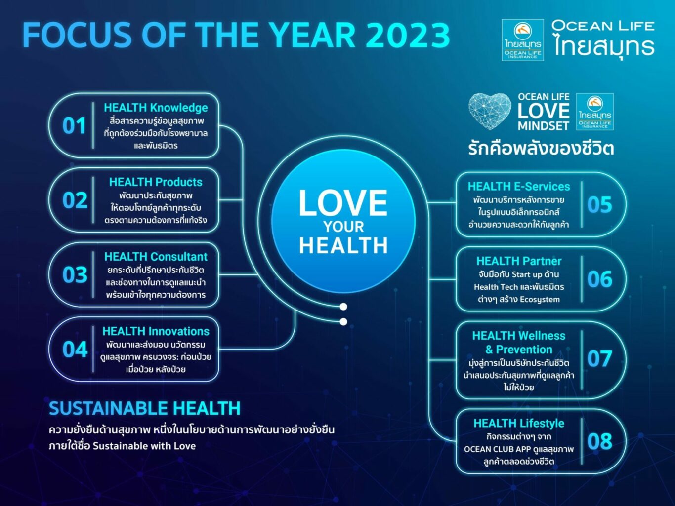 ปี 2566 OCEAN LIFE ไทยสมุทร เดินหน้าโฟกัส Love Your Health ให้คนไทยรักสุขภาพ ภายใต้แนวคิด LOVE MINDSET ด้วยการส่งเสริมให้คนไทยดูแลสุขภาพครอบคลุมทั้งสุขภาพกาย ใจ สังคม สิ่งแวดล้อม ครบทุกองค์ประกอบ ทั้งทางตรงและทางอ้อมที่มีผลต่อสุขภาพที่ดี พร้อมสร้างความตระหนักรู้ ก่อให้เกิดนวัตกรรม และกิจกรรมที่ทำให้การดูแลสุขภาพเป็นเรื่องง่าย โดยผสานความร่วมมือกับพันธมิตร ผู้เชี่ยวชาญช่วยแนะนำให้คำปรึกษา เพื่อวางแผนให้ใช้ชีวิตโดยไม่ป่วย พร้อมปิดความเสี่ยงด้วยการประกันชีวิต มุ่งลดค่าใช้จ่ายสุขภาพ และมีคุณภาพชีวิตที่ดีอย่างยั่งยืน ประกอบด้วย 8 แนวคิด โดยมีเป้าหมายสร้างโลกใหม่ที่ดีขึ้นเพื่อคนรักสุขภาพ “Healthiverse”