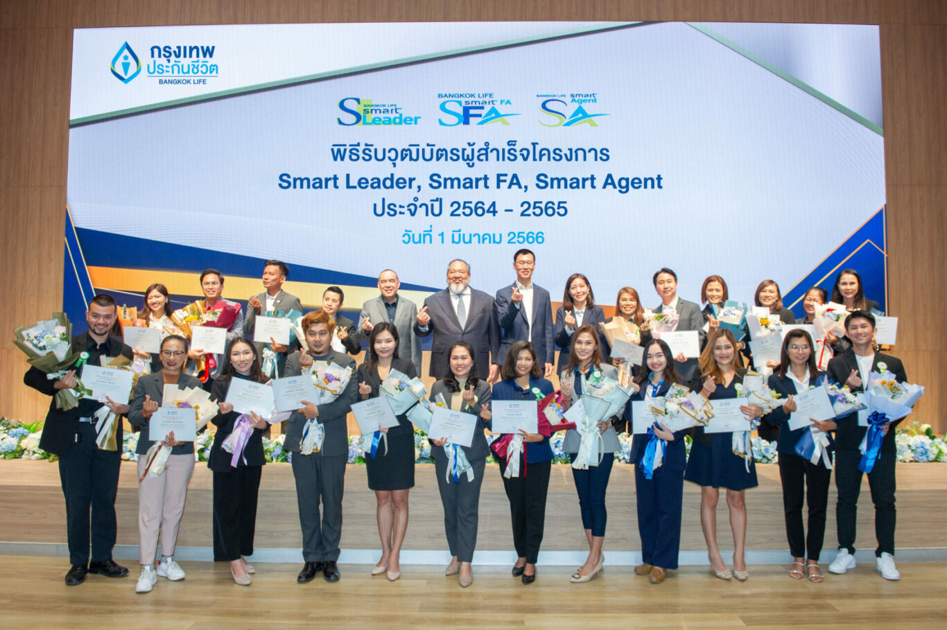 บริษัท กรุงเทพประกันชีวิต จำกัด (มหาชน) จัดพิธีมอบวุฒิบัตรสำหรับผู้สำเร็จหลักสูตรโครงการ Bangkok Life Smart Leader (BLA All Smart) เส้นทางสู่การเป็นทีมขายมืออาชีพ ประจำปี 2564 – 2565 โดยมี นายโชน โสภณพนิช (ที่ 7 จากซ้ายแถวบน) กรรมการผู้จัดการใหญ่และประธานเจ้าหน้าที่บริหาร นายอนุชา ภิงคารวัฒน์ (ที่ 6 จากซ้ายแถวบน) ผู้ช่วยผู้จัดการใหญ่สายงานตัวแทนและที่ปรึกษาทางการเงิน นายปรัชญ์ สิงหเสนี (ที่ 5 จากซ้ายแถวบน) ผู้บริหารฝ่ายพัฒนาธุรกิจตัวแทนและที่ปรึกษาทางการเงิน และนางสาวสกาว สำราญคง (ที่ 7 จากขวาแถวบน) ผู้บริหารฝ่ายฝึกอบรมช่องทางการขาย ให้เกียรติร่วมมอบวุฒิบัตรและแสดงความยินดี