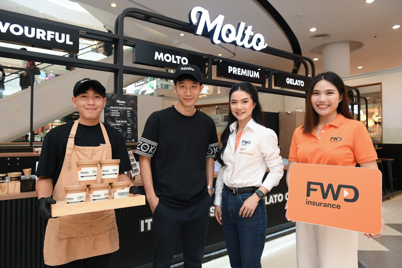 กรุงเทพฯ, ประเทศไทย – นางสาวปวริศา ชุมวิกรานต์ (ที่ 2 จากขวา) ประธานเจ้าหน้าที่สายงานภาพลักษณ์และสื่อสารองค์กร บริษัท เอฟดับบลิวดี ประกันชีวิต จำกัด (มหาชน) หรือ FWD ประกันชีวิต FWD ประกันชีวิต ประสบความสำเร็จกับกิจกรรม Brand Experience ภายใต้แคมเปญ InspirAction ด้วยการจับมือกับ “Molto” แบรนด์ไอศกรีมระดับพรีเมียม สัญชาติไทย ร่วมกันส่งความสุขผ่านความอร่อยกับการออกแบบไอศกรีมรสชาติพิเศษ Som Jeed & Choc Chip ครั้งแรกที่นำความเปรี้ยวจากส้มจี๊ดมาผสมผสานกับความเข้มของดาร์ก ช็อกโกแลตแท้ได้อย่างลงตัว ทำให้เกิดรสชาติพิเศษที่มอบความสดชื่นได้ทุกช่วงเวลา พร้อมกิจกรรมพิเศษที่จัดขึ้นเมื่อ 1 – 28 กุมภาพันธ์ที่ผ่านมา