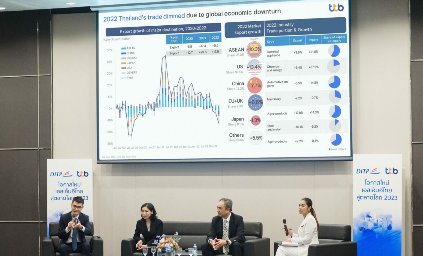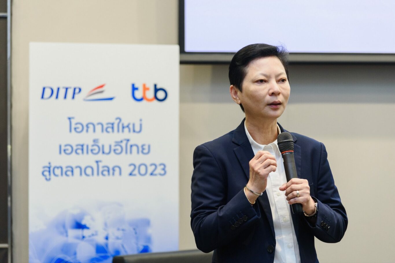 นางสาวสุกัญญา ตรีเสน่ห์จิต รองประธานเจ้าหน้าที่บริหาร หัวหน้าบริหารความสัมพันธ์ลูกค้าเอสเอ็มอี ทีเอ็มบีธนชาต หรือ ทีทีบี กล่าวว่า ธนาคารพร้อมช่วยเหลือผู้ประกอบการเอสเอ็มอีส่งออก-นำเข้าของไทย ซึ่งมักประสบปัญหาการเข้าถึงแหล่งความรู้ในการทำการค้าระหว่างประเทศ ที่มีกฎระเบียบมากมาย การจ่ายและรับเงินกับคู่ค้าระหว่างประเทศมีความซับซ้อน อีกทั้งมีความเสี่ยงต้นทุนเพิ่มจากความผันผวนของค่าเงิน เพื่อให้สามารถค้าขายระหว่างประเทศได้ดีขึ้นอย่างมีประสิทธิภาพ โดยร่วมมือกับพันธมิตรอย่างกรมส่งเสริมการค้าระหว่างประเทศ (DITP) ที่ช่วยสนับสนุนและขับเคลื่อนลูกค้าเอสเอ็มอีให้เติบโตพร้อมเดินหน้าสู่การทำตลาดต่างประเทศ ผ่านการจัดงานเสวนา “โอกาสใหม่เอสเอ็มอีไทยสู่ตลาดโลก 2023” ที่ถ่ายทอดองค์ความรู้ที่เจาะลึกถึงแนวโน้มเศรษฐกิจโลก สถานการณ์การส่งออก โอกาสและตลาดใหม่สำหรับเอสเอ็มอี พร้อมด้วยแนวทางบริหารความเสี่ยง และนโยบายส่งเสริมผู้ประกอบการจากภาครัฐ จากผู้บริหารที่มากประสบการณ์ ทั้งจากทางธนาคารและ DITP