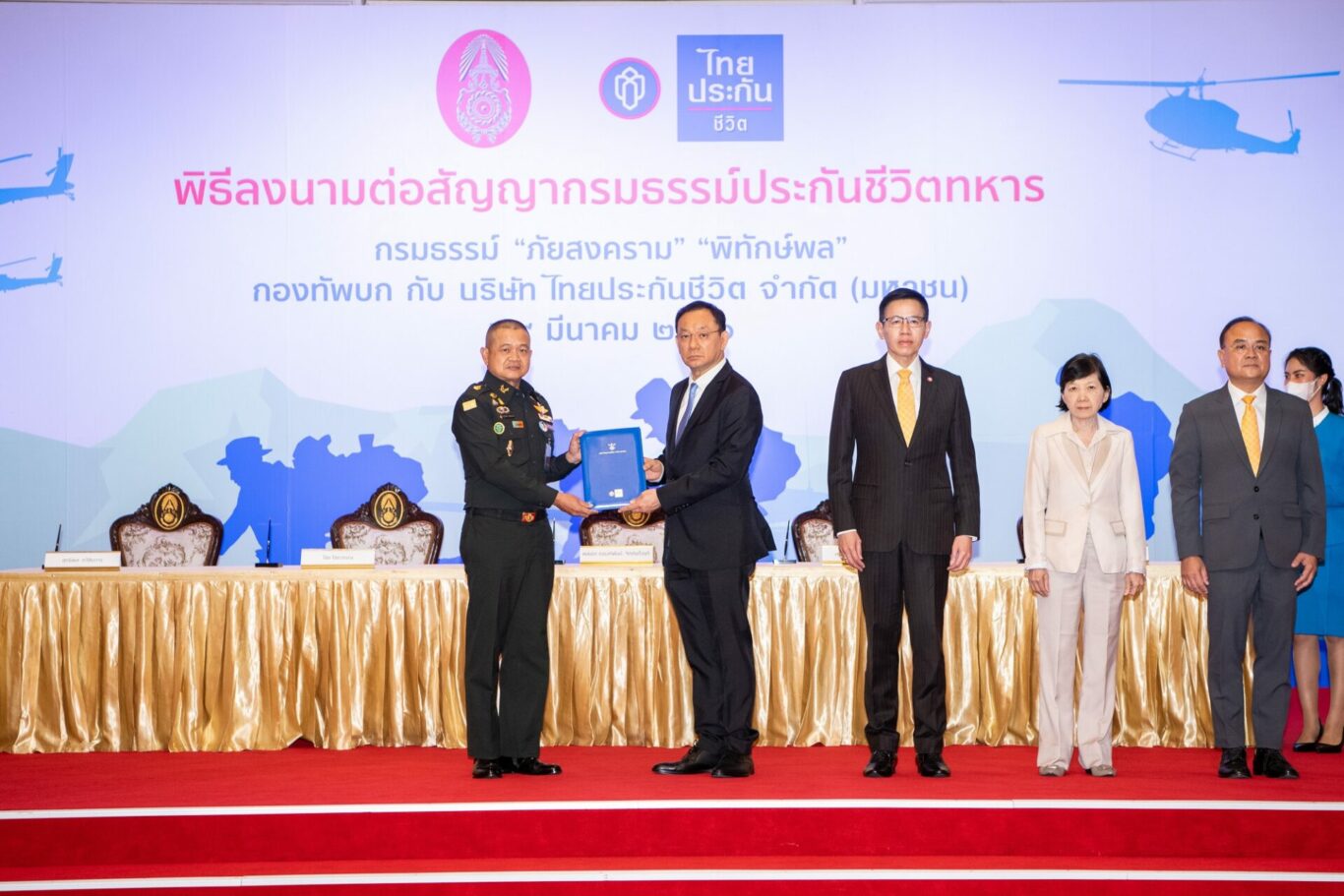 พลเอก ณรงค์พันธ์ จิตต์แก้วแท้ ผู้บัญชาการทหารบก พร้อมด้วย นายไชย ไชยวรรณ กรรมการและประธานเจ้าหน้าที่บริหาร และ นางศรีสุดา พูลพิพัฒนันท์ กรรมการบริหาร บริษัท ไทยประกันชีวิต จำกัด (มหาชน) ร่วมลงนามต่อสัญญากรรมธรรม์ประกันชีวิตทหาร ต่อเนื่องเป็นปีที่ 37 ภายใต้กรมธรรม์แบบภัยสงคราม และแบบพิทักษ์พล โดยได้รับเกียรติจาก ดร.สุทธิพล ทวีชัยการ เลขาธิการ และ นายชูฉัตร ประมูลผล รองเลขาธิการ คณะกรรมการกำกับและส่งเสริมการประกอบธุรกิจประกันภัย ร่วมเป็นสักขีพยาน ณ กองบัญชาการกองทัพบก