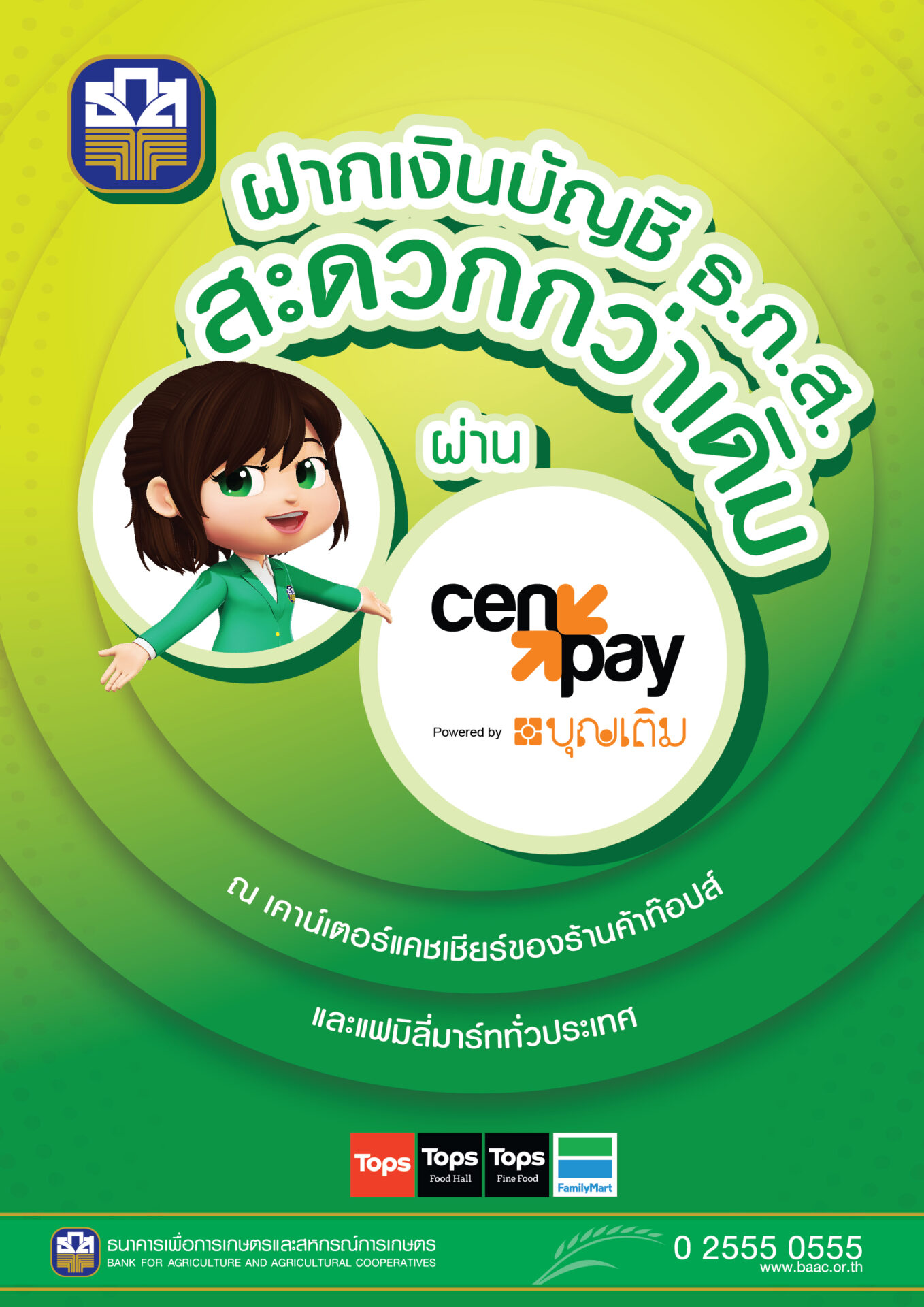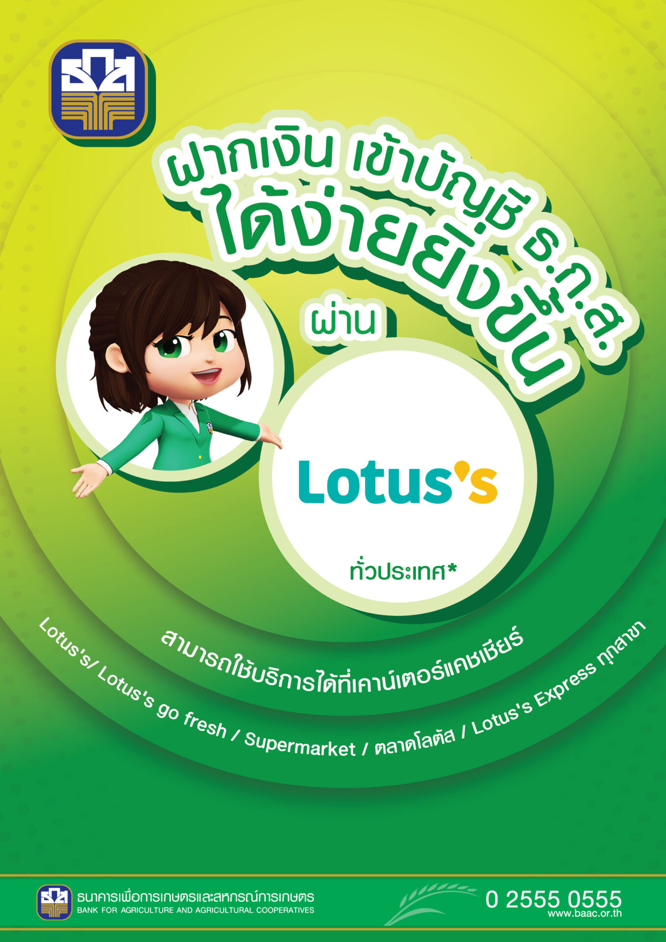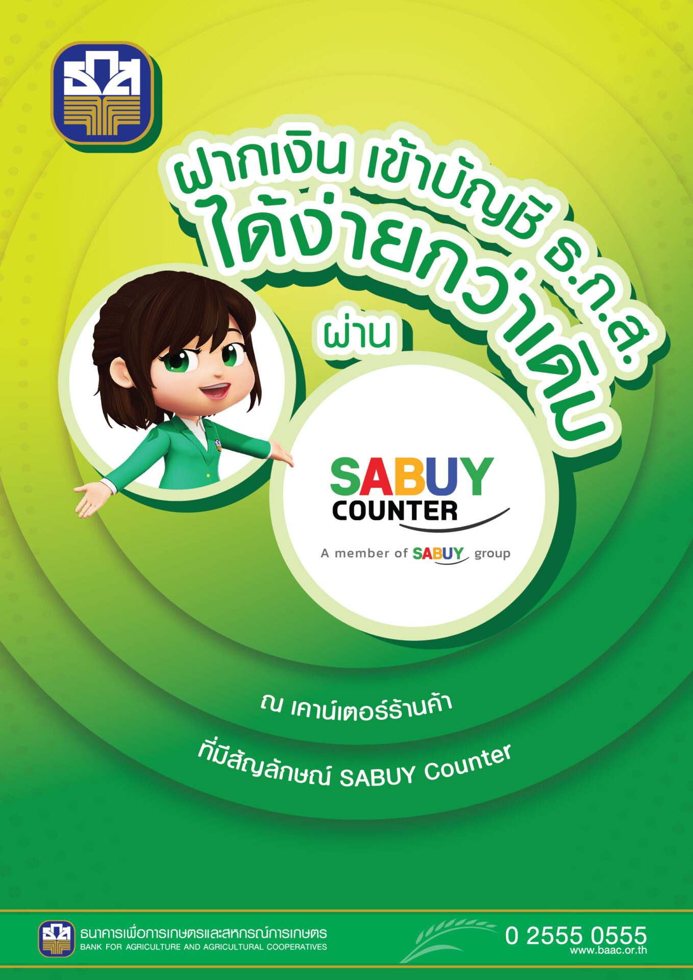 ธนาคารเพื่อการเกษตรและสหกรณ์การเกษตร (ธ.ก.ส.) เพิ่มช่องทางในการให้บริการฝากเงินสดผ่าน Banking Agent ของธนาคาร ได้แก่ เคาน์เตอร์ Lotus’s เคาน์เตอร์ Cenpay และ SABUY COUNTER เพื่ออำนวยความสะดวกให้ลูกค้า ธ.ก.ส. สามารถเข้าถึงบริการทางการเงินที่ง่ายมากขึ้นและไม่จำเป็นต้องเดินทางไปสาขา