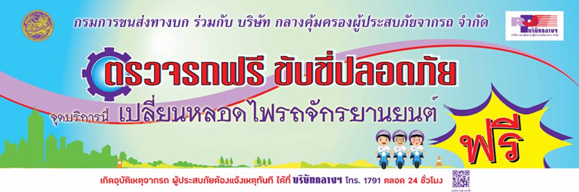 “ตรวจรถฟรี ขับขี่ปลอดภัย” บริษัทกลางฯ ร่วมกิจกรรม “ตรวจรถฟรี ขับขี่ปลอดภัย” กับกรมการขนส่งทางบก (ตั้งแต่ 15 มี.ค. ถึง 15 เม.ย. 66) โดยทำกิจกรรมเพื่อรถจักรยานยนต์ปลอดภัย ให้บริการเปลี่ยนหลอดไฟรถจักรยานยนต์ ฟรี ทั้งไฟท้าย ไฟหน้า ไฟเลี้ยว ทั่วประเทศ จำนวน 225 จุดบริการ ที่ร้านจำหน่ายรถจักรยานยนต์ ,ตรอ. และ วิทยาลัยเทคนิค ที่มีสัญลักษณ์ป้ายแบนเนอร์โครงการติดไว้ ทุกจังหวัดทั่วประเทศ (ประชาชนสามารถสอบถามรายละเอียดจุดบริการได้ที่บริษัท กลางคุ้มครองผู้ประสบภัยจากรถ จำกัด Call Center 1791 ตลอด 24 ชั่วโมง”หรือสามารถสแกน QR code รายชื่อจุดที่ให้บริการ)