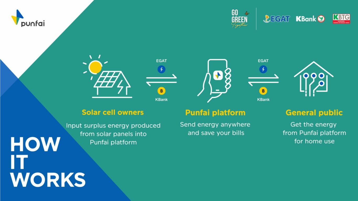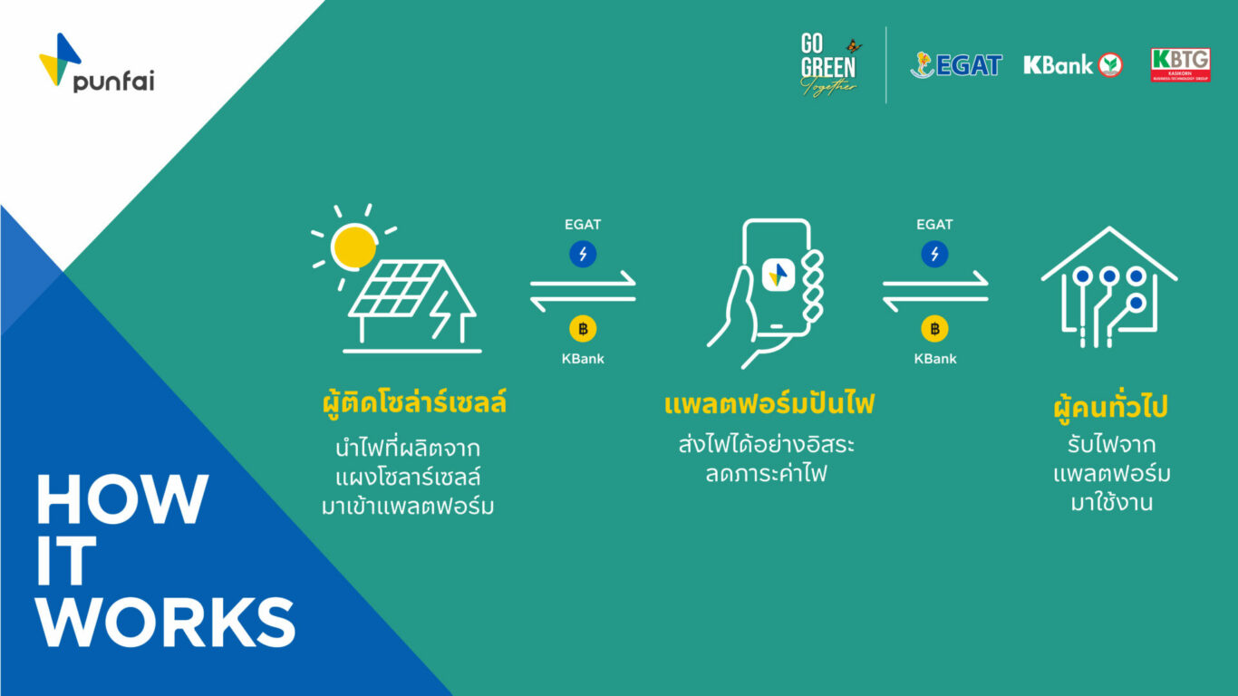 EGAT ผนึกกำลังสร้างสังคมสีเขียวร่วมกับ KBank และ KBTG ในฐานะผู้ร่วมพัฒนาแอปพลิเคชัน “ปันไฟ” (Punfai) ซึ่งเป็นแอปพลิเคชันแลกเปลี่ยนไฟฟ้าแห่งแรกของไทยที่ตอบโจทย์การใช้งานครบทุกมิติ รองรับการใช้งานทั้งภาคประชาชนและภาคธุรกิจ เพื่อเป็นส่วนหนึ่งในการขับเคลื่อนประเทศไทยสู่ Net Zero โดยแอปฯ ปันไฟ มีฟีเจอร์สำคัญ คือ ผู้ช่วยจัดสรรไฟอัจฉริยะ เมนูส่งไฟให้บุคคลอื่นได้อย่างอิสระ และรีพอร์ตสรุปภาพรวมความคุ้มค่าจากการแลกเปลี่ยนไฟฟ้า รวมถึงการเชื่อมต่อนวัตกรรมทางการเงินให้ครอบคลุมยิ่งขึ้น หวังให้คนไทยเห็นประโยชน์จากการใช้พลังงานสะอาด เพราะนอกจากจะช่วยยกระดับการสร้างโลกสีเขียวแล้ว ยังสามารถนำพลังงานจากแผงโซลาร์เซลล์ที่เหลือจากการใช้ในบ้านไปใช้ประโยชน์อื่นๆ เช่น การปันไฟให้ผู้อื่นใช้โดยได้ผลตอบแทนที่ดีกลับมา สามารถช่วยผู้ผลิตในการคืนทุนแผงโซลาร์ได้เร็วขึ้น รวมถึงเปิดโอกาสให้ประชาชนมีสิทธิ์ใช้พลังงานสะอาดในราคาไม่แพง ทั้งนี้คาดว่า “ปันไฟ” จะเริ่มทดลองใช้เฉพาะกลุ่มในไตรมาส 3 ของปีนี้ และจะขยายสู่คนไทยทุกคนในอนาคตต่อไป