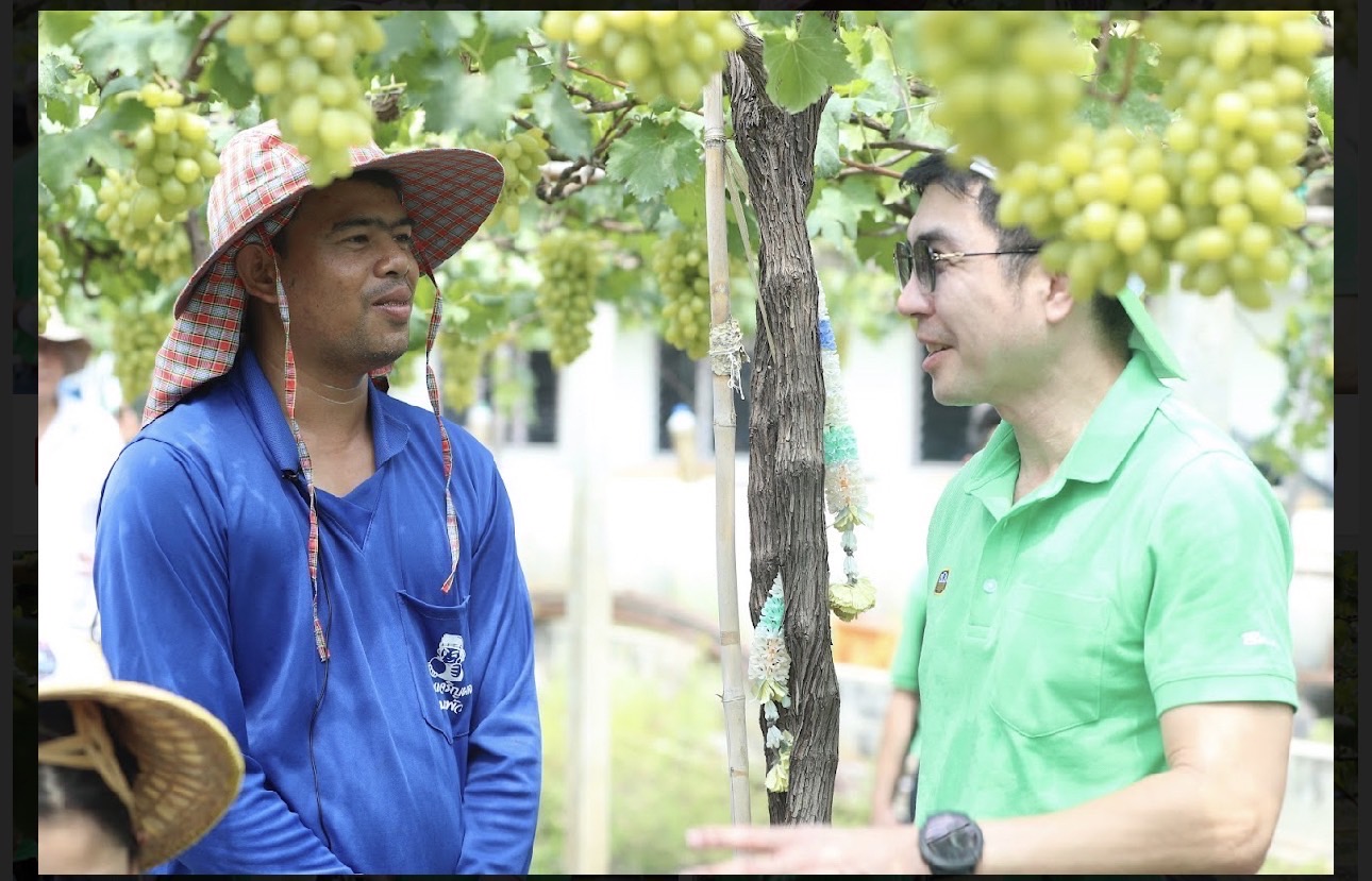 (8 เมษายน 2566) นายฉัตรชัย ศิริไล ผู้จัดการธนาคารเพื่อการเกษตรและสหกรณ์การเกษตร (ธ.ก.ส.) พร้อมด้วย นายพงษ์พันธ์ จงรักษ์ รองผู้จัดการ ธ.ก.ส. นายไพศาล หงษ์ทอง และ นายมานพ จินาไหม ผู้ช่วยผู้จัดการ ธ.ก.ส. ลงพื้นที่เยี่ยมชมงานสวนองุ่นเจริญผล ตำบลเจ็ดริ้ว อำเภอบ้านแพ้ว จังหวัดสมุทรสาคร ที่มีการปลูกองุ่นพันธุ์ไวท์มะละกามีรสชาติหวานอร่อยและเป็นที่นิยม