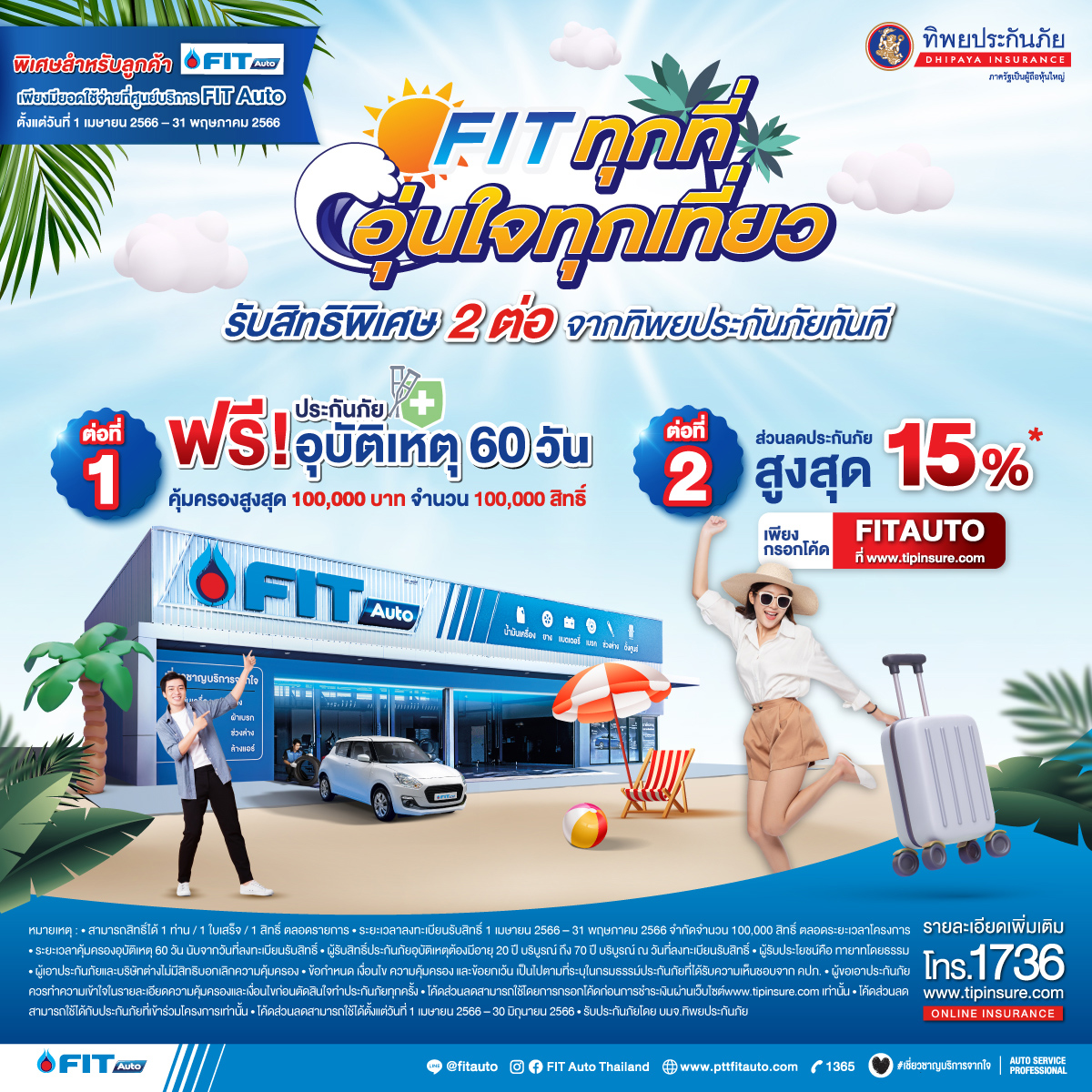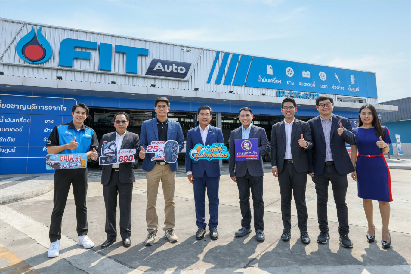 ดร. พลรัตน์ เอกโยคยะ รองกรรมการผู้จัดการใหญ่ ด้านการขายและการตลาด 2 นายณัฐพล อังควานิช ผู้อำนวยการฝ่ายพัฒนาธุรกิจและการตลาด นายชัยรัตน์ วงศ์รัตนานุกูล ผู้จัดการส่วนอาวุโส ศูนย์นวัตกรรมทิพยประกันภัย บริษัท ทิพยประกันภัย จำกัด (มหาชน) พร้อมด้วย นายไพศาล อุดมกุลวณิชย์ รองประธานเจ้าหน้าที่บริหารด้านธุรกิจหล่อลื่น นายสมสฤษฎิ์ ตรีประเสริฐสุข ผู้จัดการฝ่ายธุรกิจบริการยานยนต์ และ นายวงศ์สถิตย์ สุวรรณสุทธิ ผู้จัดการฝ่ายตลาดหล่อลื่น บริษัท ปตท.น้ำมันและการค้าปลีก จำกัด (มหาชน) ร่วมเปิดแคมเปญ “FIT ทุกที่ อุ่นใจทุกเที่ยว” ต้อนรับเทศกาลท่องเที่ยวด้วยบริการดูแลรถและเครื่องยนต์ครบวงจรจากช่างผู้เชี่ยวชาญ มอบความคุ้มค่าในราคาเบา ๆ พร้อมมอบสิทธิพิเศษสำหรับลูกค้า แบบ 2 ต่อจากทิพยประกันภัย เมื่อนำรถมาใช้บริการที่ศูนย์บริการยานยนต์ FIT Auto ทุกสาขา ตั้งแต่วันที่ 1 เมษายน – 31 พฤษภาคม 2566