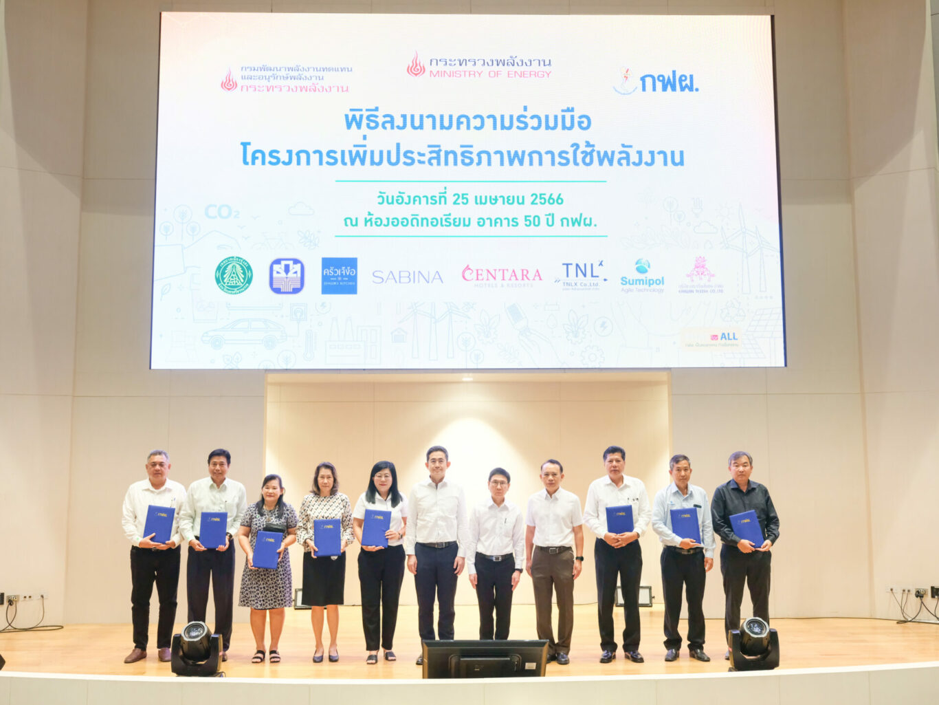 วันนี้ (25 เมษายน 2566) นายกุลิศ สมบัติศิริ ปลัดกระทรวงพลังงาน เป็นประธานในพิธีลงนามบันทึกข้อตกลงความร่วมมือโครงการเพิ่มประสิทธิภาพการใช้พลังงาน ตามโครงการรณรงค์การประหยัดพลังงานช่วงฤดูร้อน ปี 2566 ระหว่าง นายบุญญนิตย์ วงศ์รักมิตร ผู้ว่าการการไฟฟ้าฝ่ายผลิตแห่งประเทศไทย (กฟผ.) นายโสรัต โสพรรณรัตน์ รองผู้จัดการ ธนาคารเพื่อการเกษตรและสหกรณ์การเกษตร (ธ.ก.ส.) กับ หน่วยงาน ที่เข้าร่วมโครงการต่างๆ อาทิ บริษัท ซาบีน่า จำกัด (มหาชน) บริษัท ครัวเจ๊ง้อ สี่พระยา จำกัด บริษัท สุมิพล คอร์ปอเรชั่น จำกัด เทศบาลเมืองทุ่งสง บริษัท เอราวัณสิ่งทอ จำกัด บริษัท ทีเอ็นแอลเอ็กซ์ จำกัด โรงแรมและรีสอร์ทในเครือเซ็นทารา