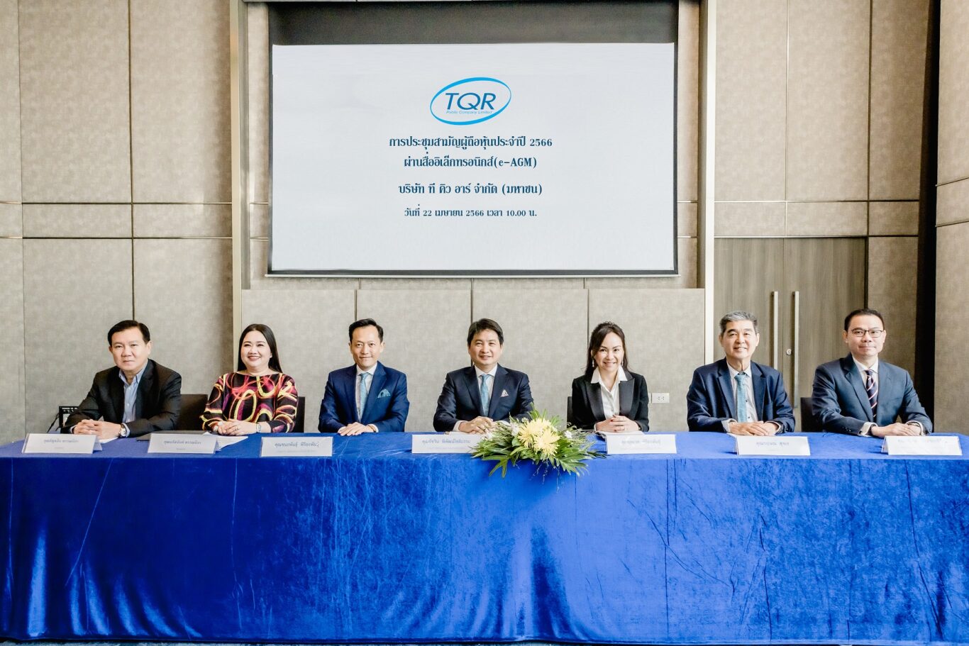 นายชัชวิน พิพัฒน์โชติธรรม (กลาง) กรรมการอิสระและกรรมการตรวจสอบ (ประธานในที่ประชุม), นายชนะพันธุ์ พิริยะพันธุ์ (ที่ 3 จากซ้าย) ประธานเจ้าหน้าที่บริหาร, นางยุพเรศ พิริยะพันธุ์ (ที่ 3 จากขวา) กรรมการและรองประธานเจ้าหน้าที่บริหาร พร้อมด้วยคณะกรรมการ บริษัท ที คิว อาร์ จำกัด (มหาชน) (TQR) เข้าร่วมการประชุมสามัญผู้ถือหุ้นประจำปี 2566 ผ่านระบบสื่ออิเล็กทรอนิกส์ (E-AGM)