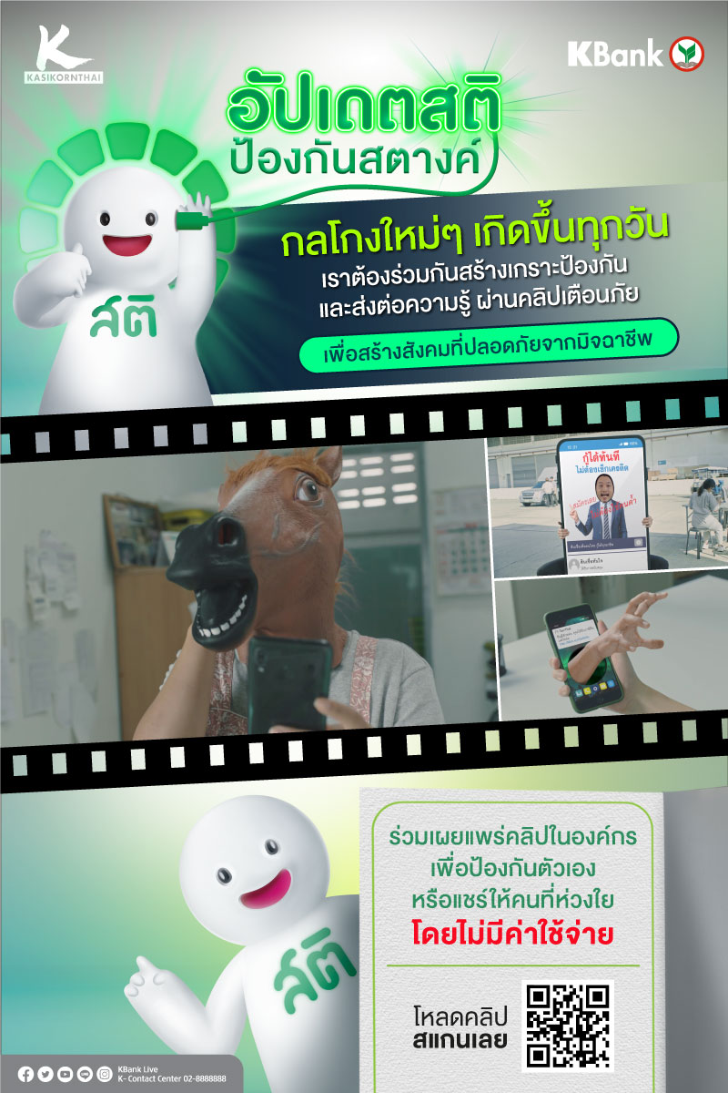 ทั้งนี้ แคมเปญ #อัปเดตสติป้องกันสตางค์ เป็นแคมเปญต่อเนื่องจากแคมเปญ #ใช้สติป้องกันสตางค์ ที่ธนาคารกสิกรไทย ริเริ่มตั้งแต่ปี 2562 เป็นต้นมา เพื่อรณรงค์ให้ข้อมูลและความรู้กับประชาชนถึงภัยกลโกงของมิจฉาชีพ ในปีนี้ธนาคารเดินหน้าต่อออกคลิปเตือนภัย 3 กลโกงที่มีเหยื่อโดนหลอกอย่างต่อเนื่อง พลาดท่าเสียทั้งเงิน และมีคดีติดตัว ได้แก่ (1) มิจฉาชีพหลอกให้โหลดแอปพลิเคชันดูดเงิน (2) มิจฉาชีพหลอกว่าเป็นนายหน้าเงินกู้ และ (3) มิจฉาชีพหลอกให้เปิดบัญชีม้า เห็นได้ว่ากรณีเหล่านี้ เกิดขึ้นอย่างแพร่หลายมาก ซึ่งหลายคนอาจจะเคยประสบด้วยตัวเอง คนใกล้ตัว หรือได้ยินจากข่าว แต่ก็มีผู้ตกเป็นเหยื่ออยู่อย่างต่อเนื่อง เพราะด้วยเทคนิคกลโกงของมิจฉาชีพมีวิธีพูดโน้มน้าวใจให้คนเชื่อ หากคนที่ไม่เคยได้ยินเรื่องราวมาก่อน อาจตกเป็นเหยื่อของมิจฉาชีพได้ จึงเป็นเรื่องสำคัญที่ทุกคนจะช่วยกันเตือนคนใกล้ตัว พนักงาน ญาติพี่น้อง ให้รู้เท่าทันภัยเหล่านี้ และป้องกันความเสียหายที่อาจจะเกิดขึ้น