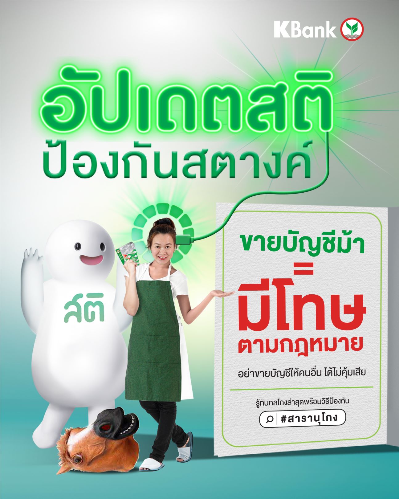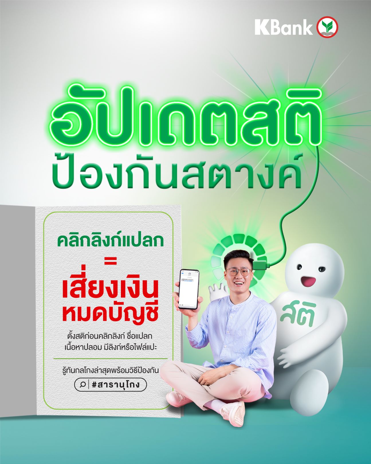 เคแบงก์ เตือนภัยมิจฉาชีพหลอกเงินที่สร้างความเสียหายกับประชาชนกว่า 31,000 ล้านบาท เร่งให้ความรู้และวางมาตรการป้องกันภัยคุกคามทางการเงิน ผ่านแคมเปญ #อัปเดตสติป้องกันสตางค์ พร้อมเชิญชวนประชาชนและหน่วยงานต่างๆ ร่วมเป็นแนวร่วมเผยแพร่ข้อมูล ช่วยสร้างสังคมรู้ทันภัยมิจฉาชีพหลอกเอาเงินที่ใช้วิธีแนบเนียนมากยิ่งขึ้น ออกคลิป เตือนภัย 3 กลโกงที่ยังมีเหยื่อโดนหลอกต่อเนื่อง พลาดท่าเสียทั้งเงิน และมีคดีติดตัว ได้แก่ (1) มิจฉาชีพหลอกให้โหลดแอปพลิเคชันดูดเงิน (2) มิจฉาชีพหลอกเป็นนายหน้าเงินกู้ (3) มิจฉาชีพหลอกให้เปิดบัญชีม้า พร้อมจัดทำสื่อ #สารานุโกง อัปเดตกลโกงใหม่ๆ ของมิจฉาชีพ บนเว็บไซต์ https://kbank.co/41NmBTW ให้หน่วยงานต่างๆ สามารถดาวน์โหลดได้ฟรี!