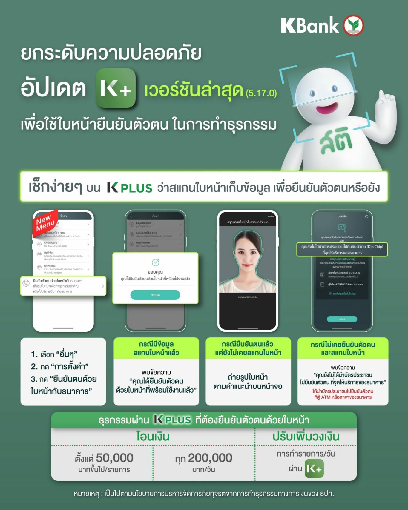 ทั้งนี้ เพื่อความปลอดภัยในการทำธุรกรรม ลูกค้า K PLUS ต้องยืนยันตัวตนด้วยการสแกนใบหน้าในการทำธุรกรรม 3 ประเภท ได้แก่ 1) โอนเงินตั้งแต่ 50,000 บาทขึ้นไปต่อรายการ 2) โอนเงินเมื่อมียอดรวมการโอนทุก 200,000 บาทต่อวัน 3) ปรับเพิ่งวงเงินการทำรายการต่อวัน