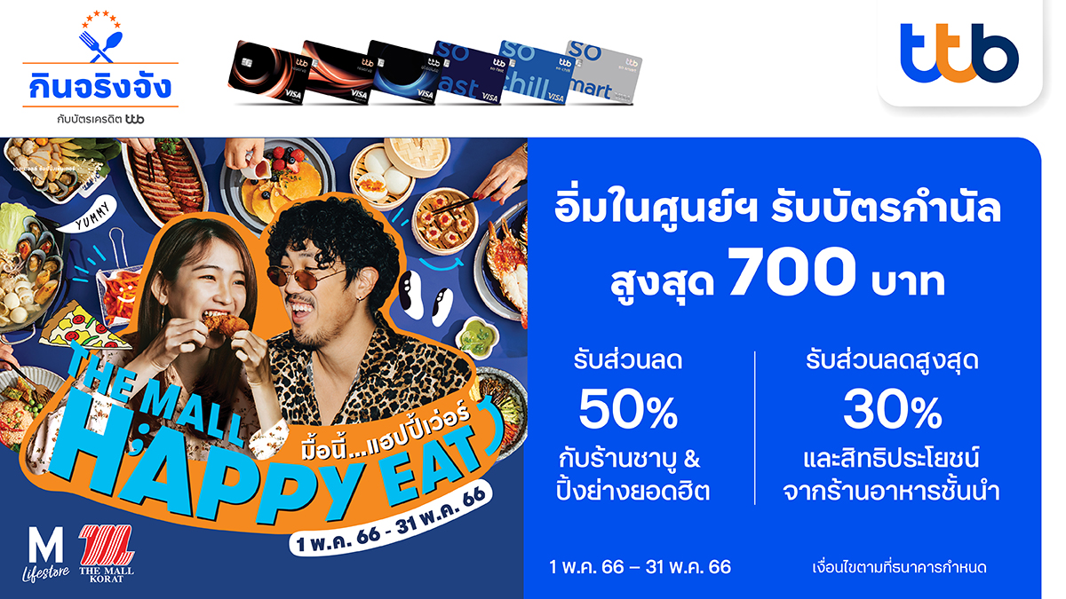 ทีเอ็มบีธนชาต หรือ ทีทีบี มอบประสบการณ์สุดพิเศษให้แก่ผู้ถือบัตรเครดิต ttb ร่วมกับ ศูนย์การค้าเดอะมอลล์ และเดอะมอลล์ไลฟ์สโตร์ จัดแคมเปญ THE MALL HAPPY EAT x ttb มื้อนี้… แฮปปี้เว่อร์ ให้ส่วนลดมากมาย อิ่มอร่อยภายในศูนย์การค้า รับบัตรกำนัลสำหรับรับประทานอาหารรวมสูงสุด 700 บาท และอิ่มคุ้ม!! จ่ายครึ่งราคา เอาใจคนรักชาบู และปิ้งย่างยอดฮิต ตั้งแต่วันนี้ ถึง 31 พฤษภาคม 2566 ที่ เดอะมอลล์ไลฟ์สโตร์ ท่าพระ, งามวงศ์วาน และเดอะมอลล์ โคราช