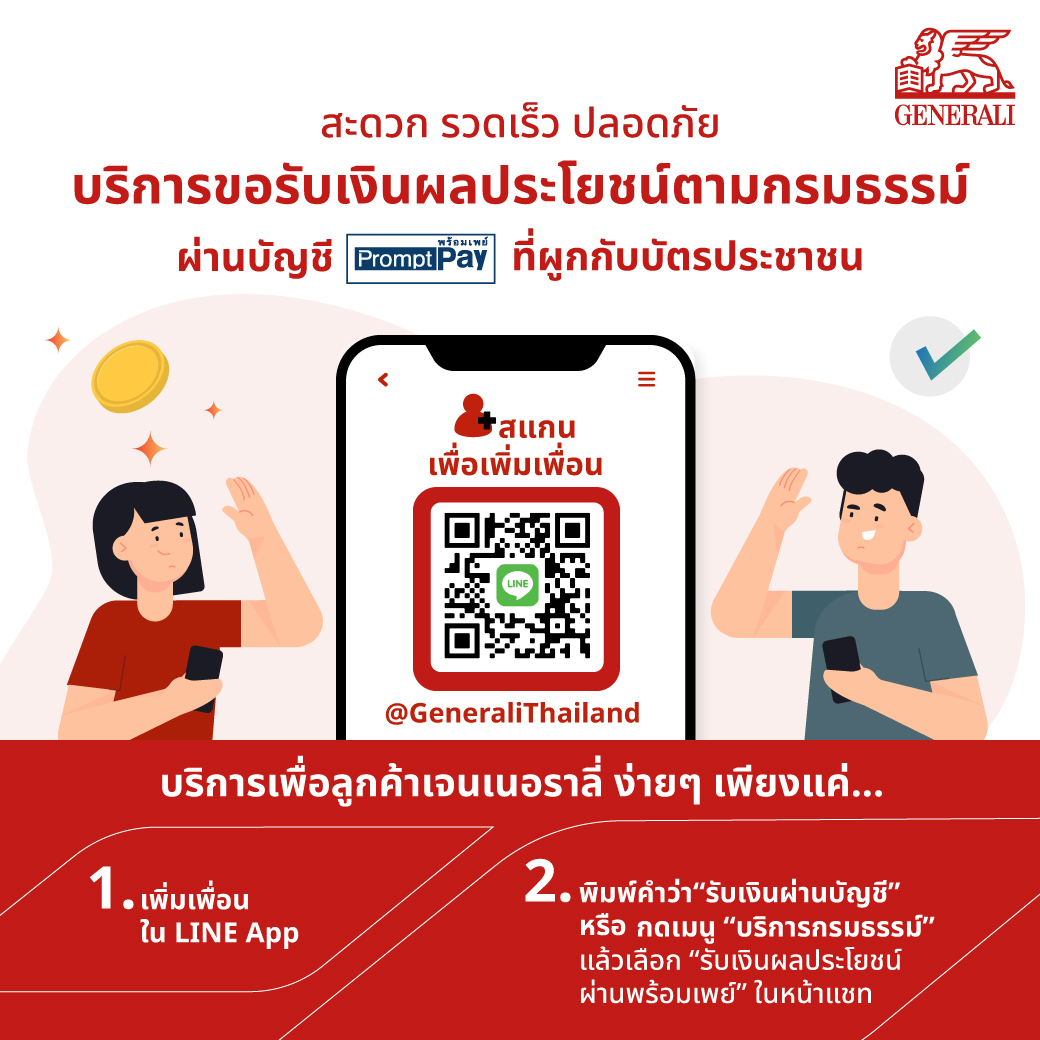 เจนเนอราลี่ ไทยแลนด์ เปิดบริการเพิ่มช่องทางการรับเงินผลประโยชน์ตามกรมธรรม์ ผ่านบัญชีพร้อมเพย์โดยเลขที่บัตรประชาชนให้แก่ลูกค้า เพื่อความรวดเร็ว สะดวก และปลอดภัยมากยิ่งขึ้น พร้อมเปิดให้สมัครบริการผ่าน Line Official @GeneraliThailand เพียงพิมพ์ว่า “รับเงินผ่านบัญชี” หรือ เลือก “บริการกรมธรรม์” สำหรับบริการขอรับเงินผลประโยชน์ตามกรมธรรม์ผ่านทางพร้อมเพย์ (PromptPay) โดยใช้เลขที่บัตรประชาชนที่ผูกกับบัญชีธนาคารนั้น เป็นทางเลือกใหม่สำหรับลูกค้า เจนเนอราลี่ ไทยแลนด์ ที่ออกแบบมาเพื่อเพิ่มความสะดวกสบายให้กับลูกค้าในการขอรับเงินผลประโยชน์ อาทิ เงินปันผล เงินคืนตามเงื่อนไขกรมธรรม์ เงินกู้ตามกรมธรรม์ เงินคืนสินไหมทดแทน เป็นต้น เป็นทางเลือกเพิ่มเติมจากการรับเงินรูปแบบเดิม ได้แก่ การรับเช็ค และรับเงินผ่านบัญชีธนาคาร โดยบริการโอนเงินผ่านบัญชีพร้อมเพย์ที่สมัครโดยใช้เลขบัตรประชาชน มีความรวดเร็ว และปลอดภัยมากกว่า เป็นระบบที่มีความปลอดภัยสูงตามมาตรฐานสากล ลูกค้าไม่ต้องกังวลเรื่องการจัดส่งเช็คล่าช้า หรือสูญหายระหว่างการจัดส่ง ลดระยะเวลารอเคลียร์ริ่ง รวมถึงไม่ต้องส่งสำเนาหน้าสมุดบัญชี เพิ่มความสะดวกให้กับลูกค้ามากยิ่งขึ้น