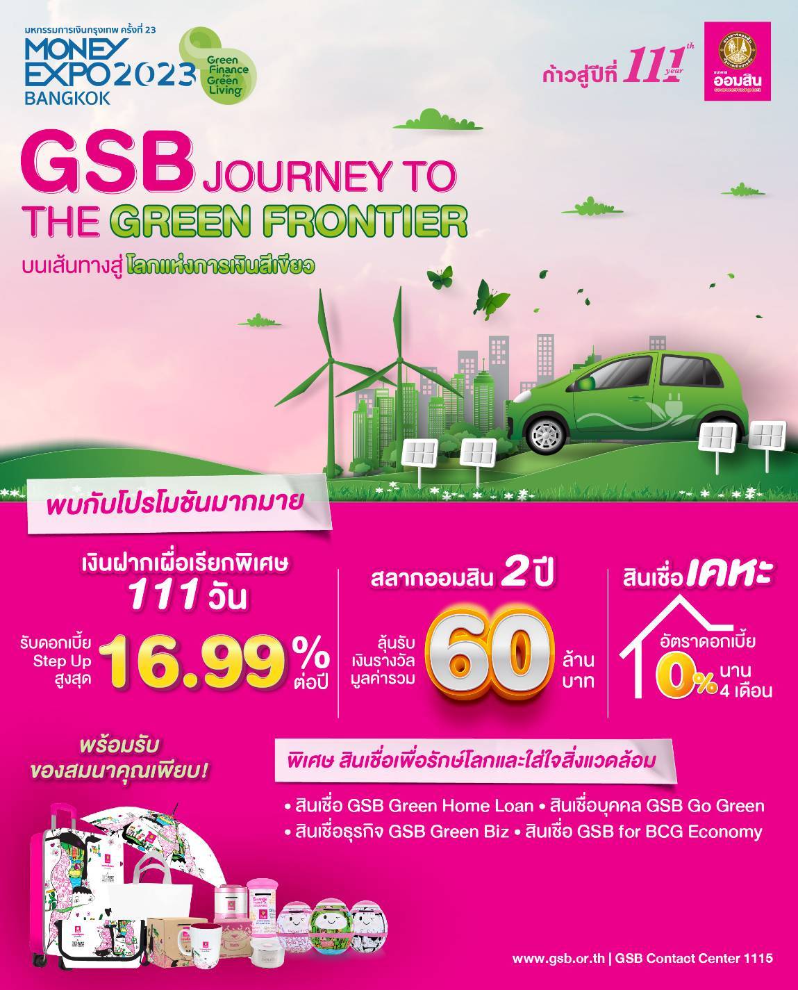 มหกรรมการเงิน Money Expo 2023 ครั้งนี้ ธนาคารออมสินเข้าร่วมงานอย่างยิ่งใหญ่ ภายใต้แนวคิด “GSB Journey to The Green Frontier : ธนาคารออมสิน บนเส้นทางสู่โลกแห่งการเงินสีเขียว” ซึ่งสอดคล้องตามยุทธศาสตร์ธนาคารเพื่อสังคมที่มุ่งเน้นดำเนินการตามกรอบ ESG โดยให้ความสำคัญตั้งแต่กระบวนการจัดทำบูธที่เลือกใช้วัสดุที่เป็นมิตรต่อสิ่งแวดล้อม การออกแบบผลิตภัณฑ์และบริการที่เน้นสร้างผลกระทบเชิงบวกต่อสังคม ซึ่งเป็นไปตามแนวคิดการจัดงาน “Green Finance for Green Living : การเงินสีเขียวเพื่อชีวิตสีเขียว” แล้วพบกันที่งานมหกรรมการเงิน Money Expo ครั้งที่ 23 ณ อิมแพ็ค เมืองทองธานี ระหว่างวันที่ 11-14 พ.ค. 2566.