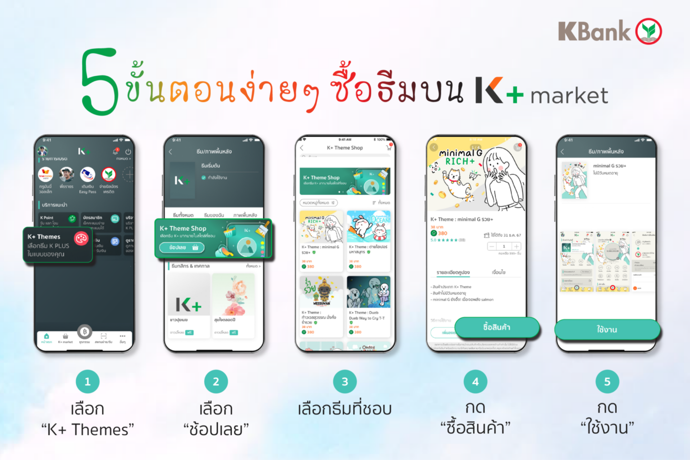 โดยลูกค้า K PLUS สามารถซื้อได้แล้ววันนี้บน K+ market ราคาธีมละ 38 บาท หรือใช้คะแนนสะสม K Point แลกซื้อเพียง 380 คะแนน