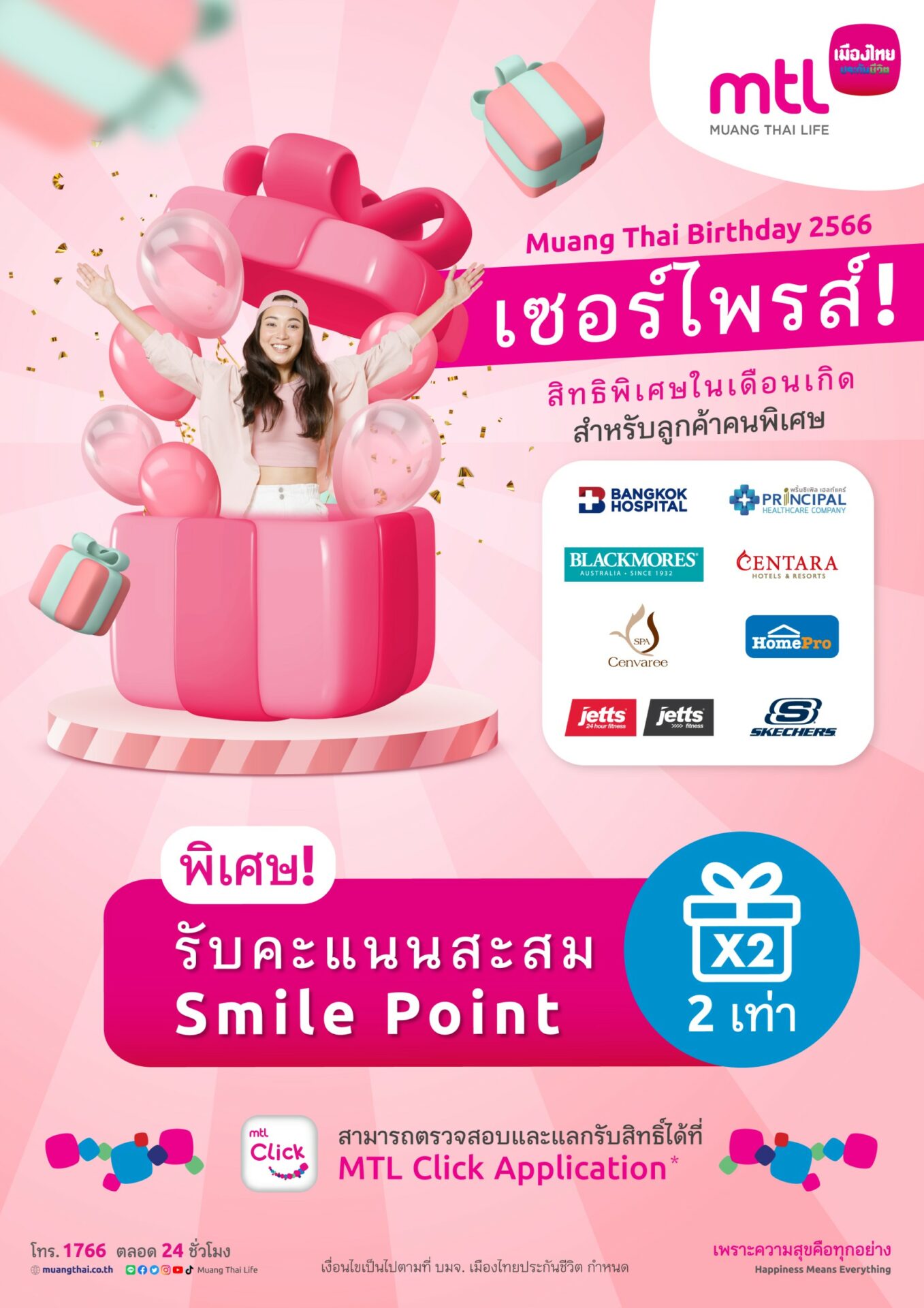 “ทุกประสบการณ์แห่งการดูแล การสร้างสรรค์กิจกรรม สิทธิประโยชน์และแคมเปญต่างๆ ที่ตอบรับกับ Lifestyle ของลูกค้าและสมาชิกเมืองไทยสไมล์คลับ ในการสร้างความสุขและรอยยิ้ม ที่ทุกท่านสามารถเข้าร่วมได้ตลอดทั้งปี 2566 โดยการรับสิทธิพิเศษฟรี ส่วนลดร้านค้า และการแลกคะแนนสะสม Smile Point เพื่อให้ลูกค้าสัมผัสได้ถึงความรู้สึกคุ้มค่ามากกว่าแค่คุ้มครอง ผ่านสิทธิประโยชน์ และกิจกรรมที่ตอบโจทย์ทุก Gen ตอบรับทุก Lifestyle ยกระดับการใช้ชีวิตของคุณสู่ Digital Lifestyle โดยลูกค้าเมืองไทยประกันชีวิต สามารถดูรายละเอียดสิทธิพิเศษในเดือนเกิดได้ที่ www.muangthai.co.th และกดรับสิทธิพิเศษได้ในวันเกิดของลูกค้า ผ่านแอปพลิเคชัน MTL Click ซึ่งมีระยะเวลาการรับสิทธิ์ 90 วันนับจากวันเกิด สอบถามรายละเอียดเพิ่มเติม โทร. 1766 เมืองไทยประกันชีวิต หรือศูนย์บริการลูกค้า ทั่วประเทศ”