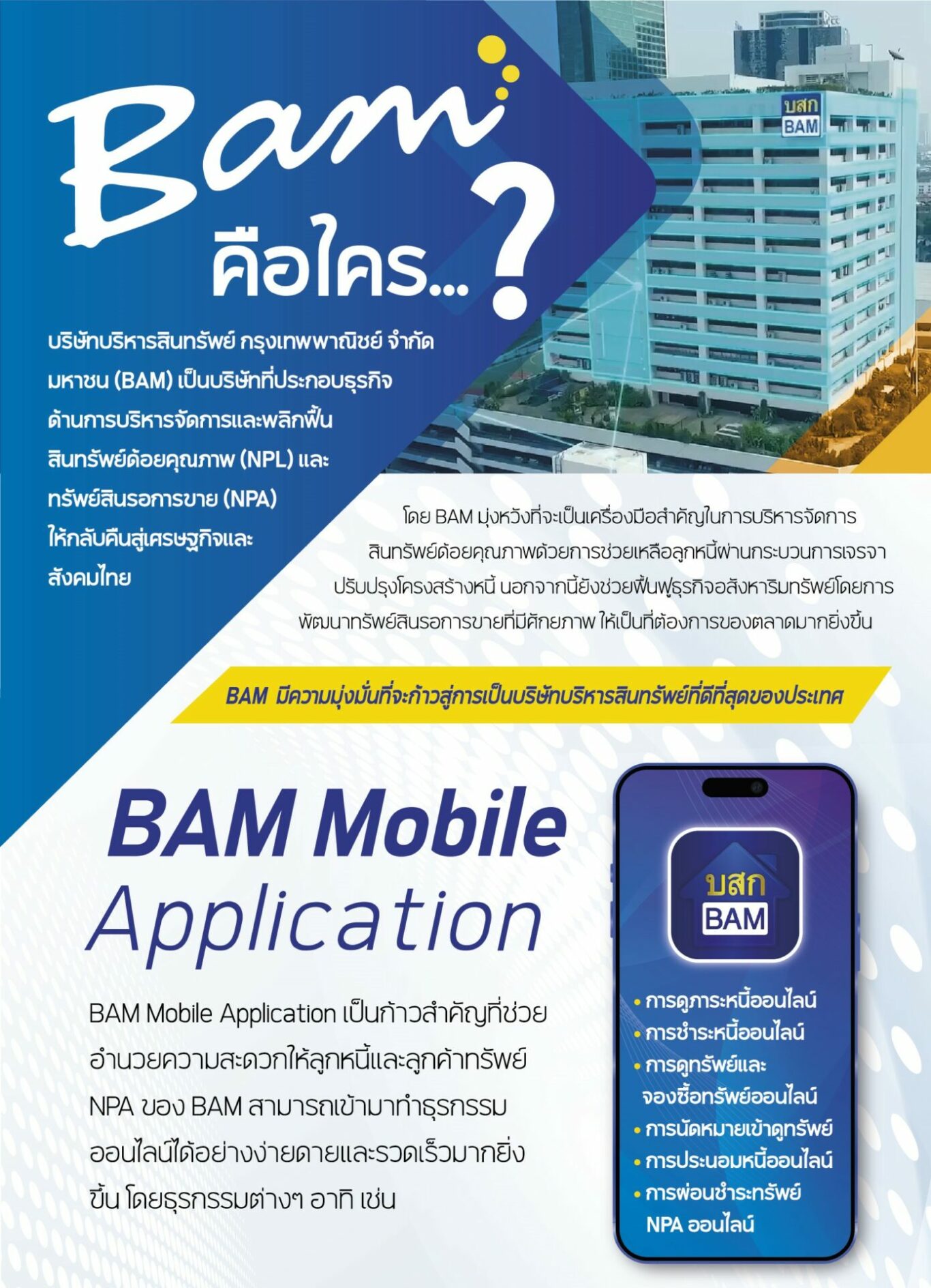 โดยงานนี้ BAM ได้ร่วมออกบูธแนะนำ BAM Mobile Application เพื่อตอบโจทย์การให้บริการลูกหนี้ และลูกค้าซื้อทรัพย์ภายในปี 2566 ซึ่งลูกหนี้และลูกค้าซื้อทรัพย์สามารถเข้ามาทำธุรกรรมได้สะดวกและรวดเร็วมากยิ่งขึ้น เช่น การดูภาระหนี้ออนไลน์ การชำระหนี้ออนไลน์ การดูทรัพย์และจองซื้อทรัพย์ออนไลน์ การนัดหมายเข้าดูทรัพย์ การประนอมหนี้ออนไลน์ การผ่อนชำระทรัพย์ NPA ออนไลน์ โดยใช้ระบบการพิสูจน์และยืนยันตัวตนผ่าน Application ThaiD วันที่ 13 มิถุนายน 2566 ณ ห้องประชุมอัศวิน แกรนด์บอลรูม โรงแรมอัศวิน แกรนด์ คอนเวนชั่น กรุงเทพฯ