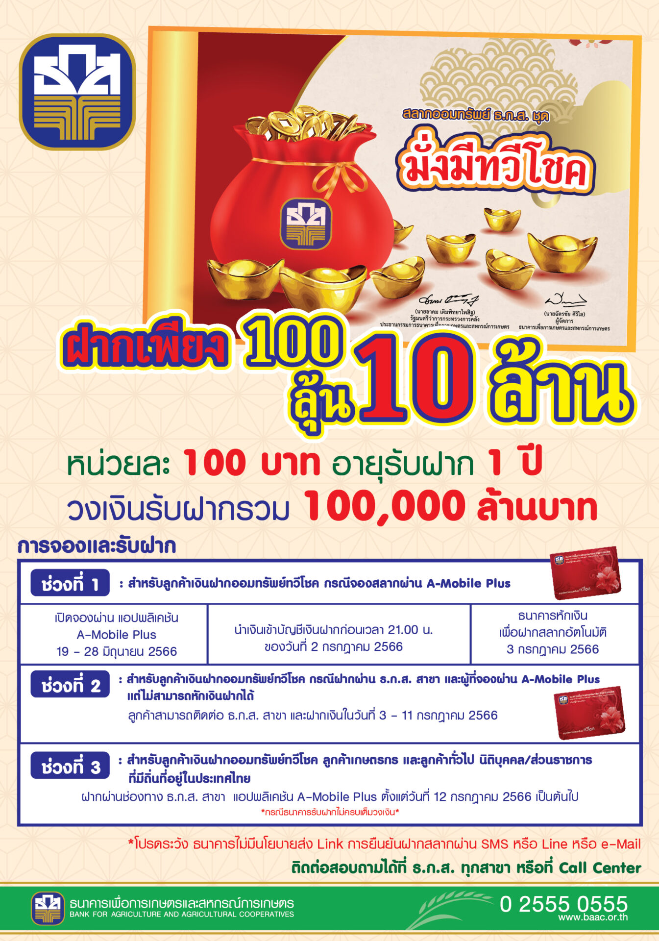 ธ.ก.ส. เปิดตัวสลากมั่งมีทวีโชค ฝาก 100 ลุ้นรางวัลใหญ่ 10 ล้านบาท เปิดจองแล้ววันนี้