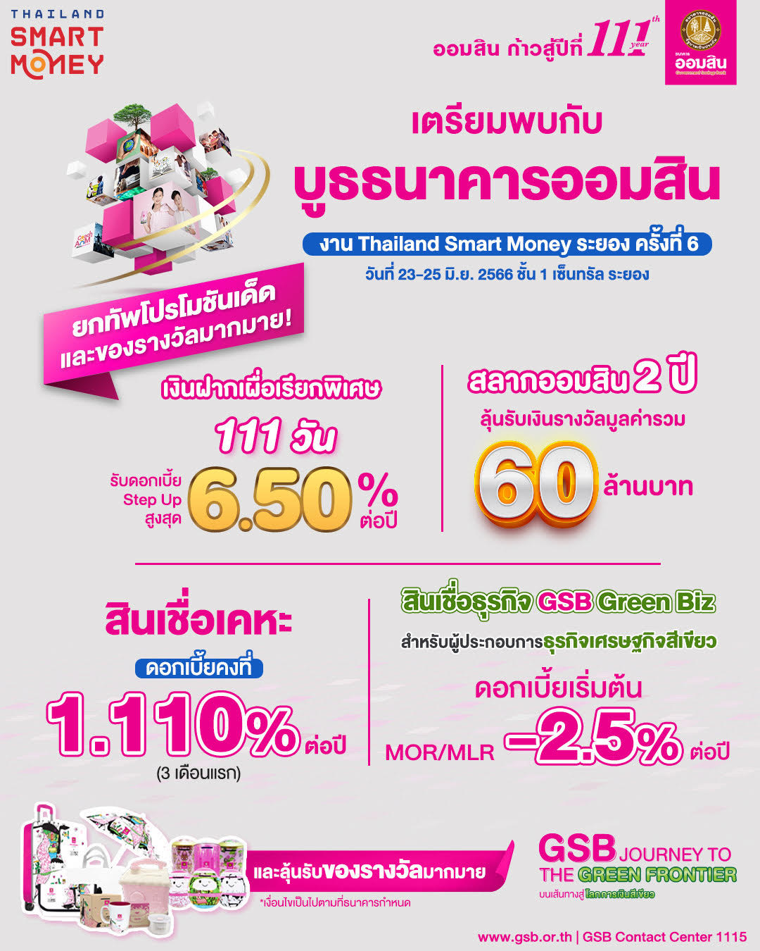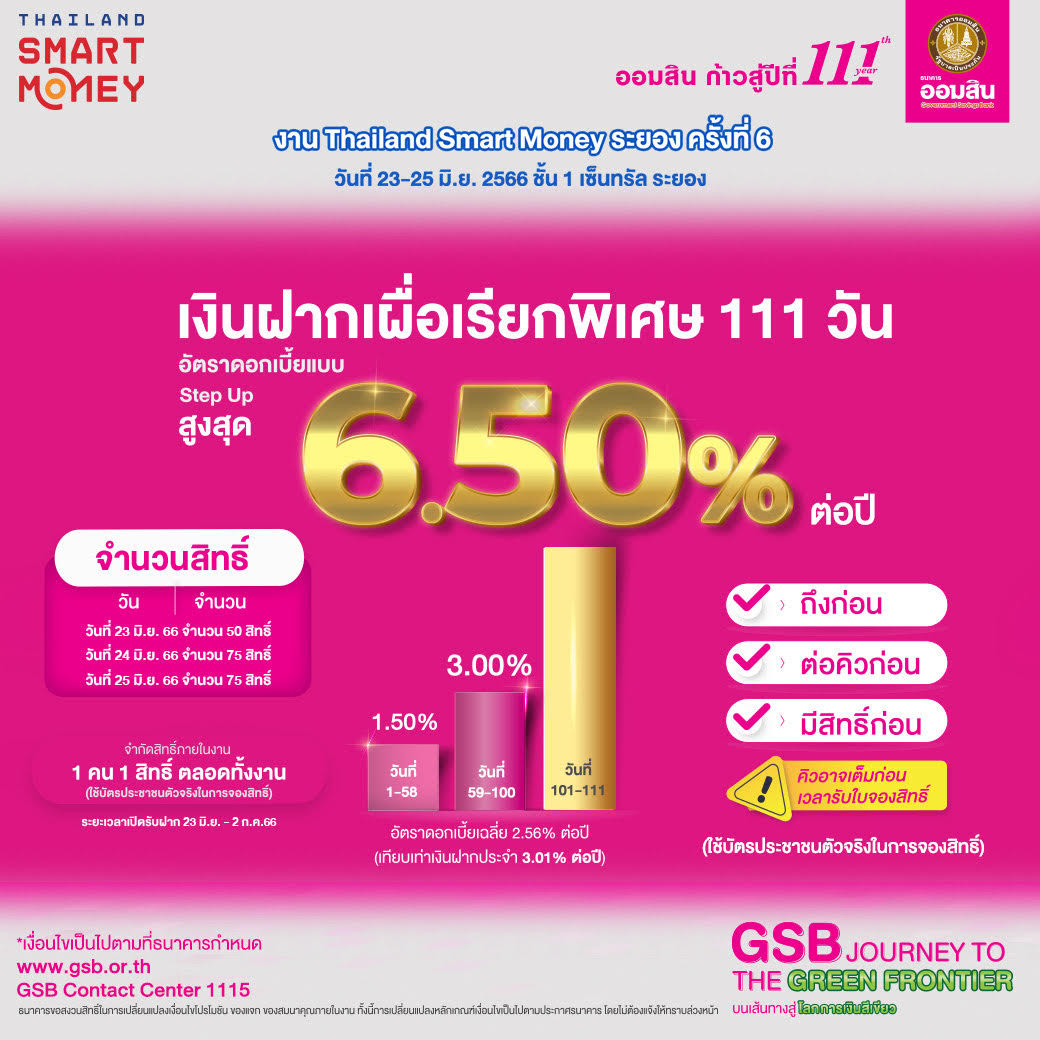 ธนาคารออมสิน เข้าร่วมงาน Thailand Smart Money ระยอง ครั้งที่ 6 โดยจัดโปรโมชันเงินฝาก สินเชื่อ และบริการทางการเงินครบครัน ได้แก่ เงินฝากเผื่อเรียกพิเศษ 111 วัน ระยะเวลาฝาก 111 วัน ดอกเบี้ย Step up สูงสุด 6.50% ต่อปี คิดเป็นอัตราดอกเบี้ยเฉลี่ย 2.56% ต่อปี ได้รับยกเว้นภาษี รับฝากบุคคลธรรมดา สูงสุดไม่เกิน 500,000 บาท มีจำนวน 200 สิทธิ์ เปิดจองสิทธิ์ภายในงานเท่านั้น ตามด้วยแคมเปญสลากออมสินพิเศษ 2 ปี เพิ่มรางวัลพิเศษ 30 ล้านบาท นอกเหนือจากรางวัลที่ 1 ที่มีเงินรางวัล 30 ล้านบาท รวมมูลค่าเงินรางวัลสูงสุดถึง 60 ล้านบาท รับฝากทั้งแบบใบสลาก และสลากดิจิทัล หน่วยละ 100 บาท