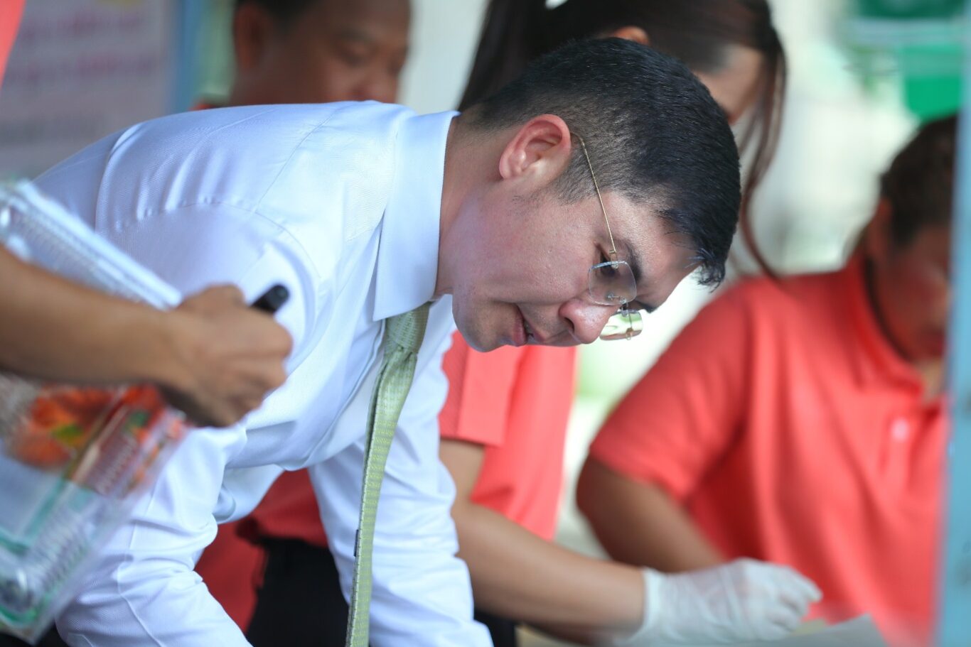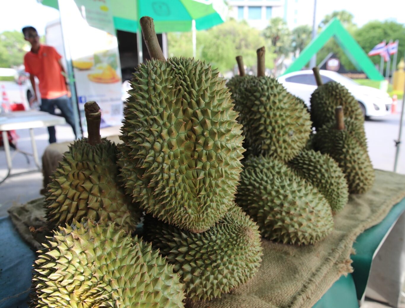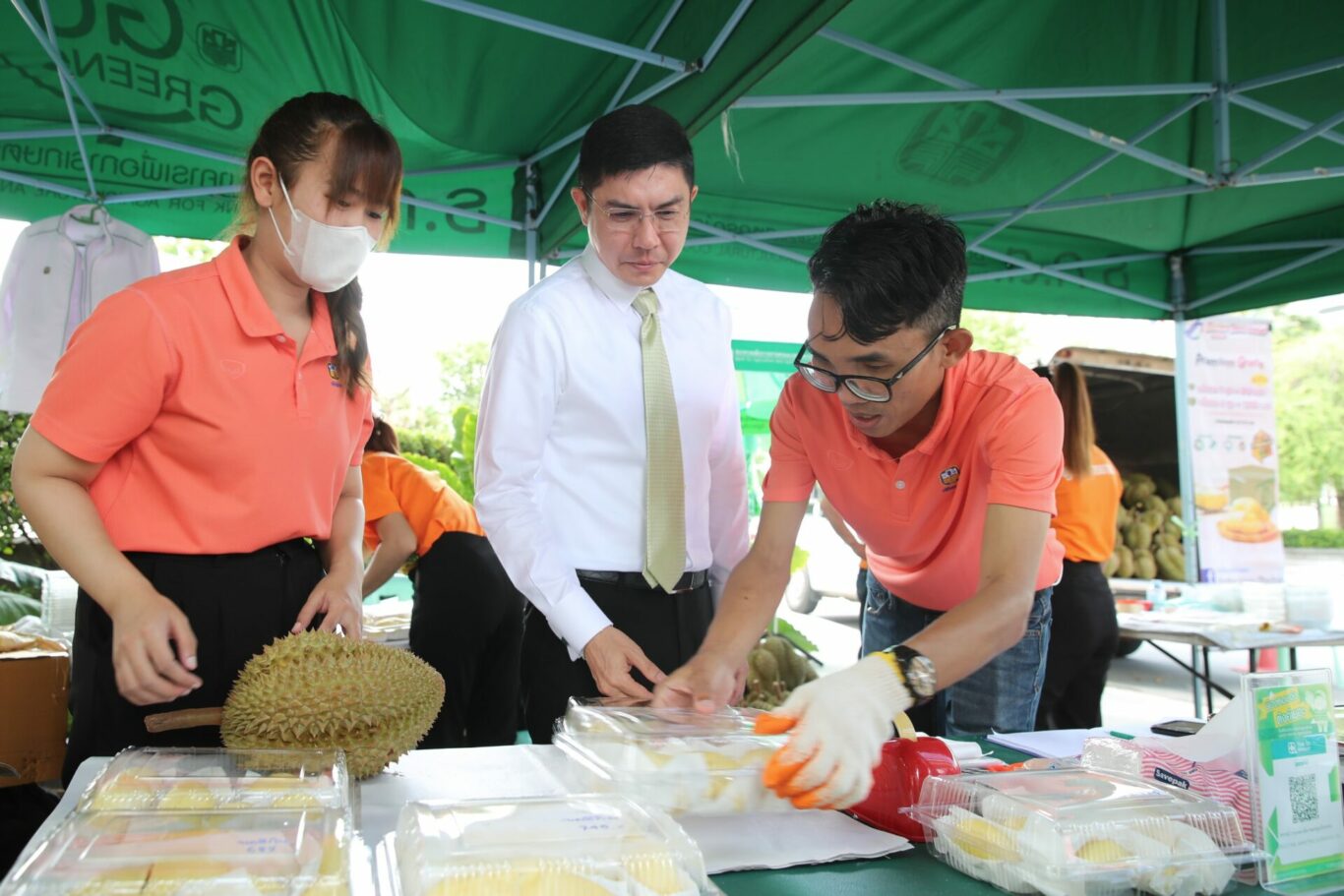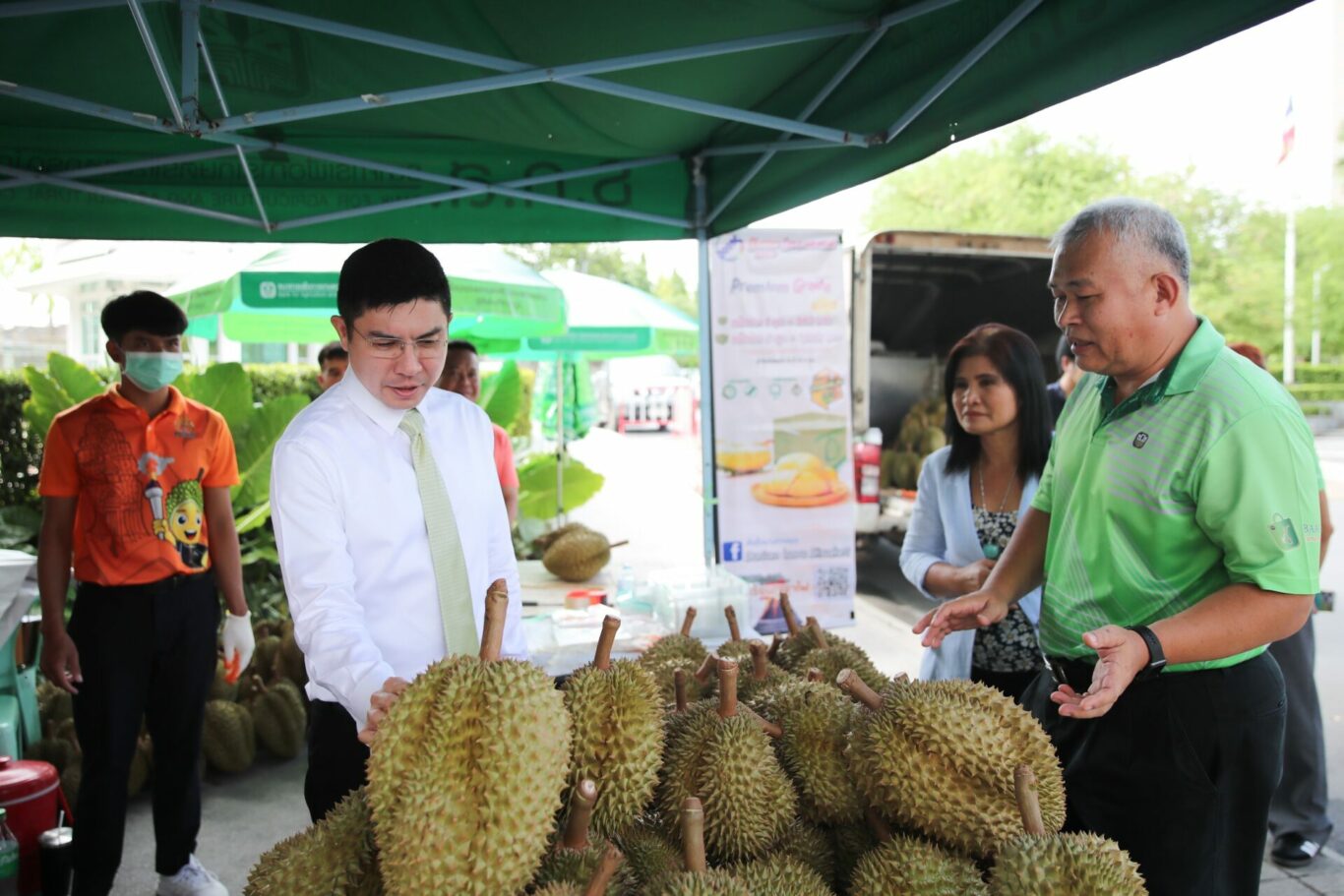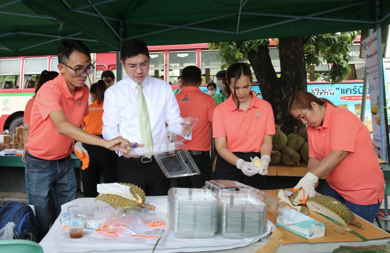 นายฉัตรชัย ศิริไล ผู้จัดการธนาคารเพื่อการเกษตรและสหกรณ์การเกษตร (ธ.ก.ส.) เยี่ยมชมบูธและชิม ช้อปทุเรียนภูเขาไฟศรีสะเกษ จากสหกรณ์การเกษตรเพื่อการตลาดลูกค้า ธ.ก.ส. ศรีสะเกษ จำกัด (สกต. ศรีสะเกษ) ที่มาออกบูธบริเวณหน้า ธ.ก.ส. สำนักงานใหญ่ กรุงเทพมหานคร