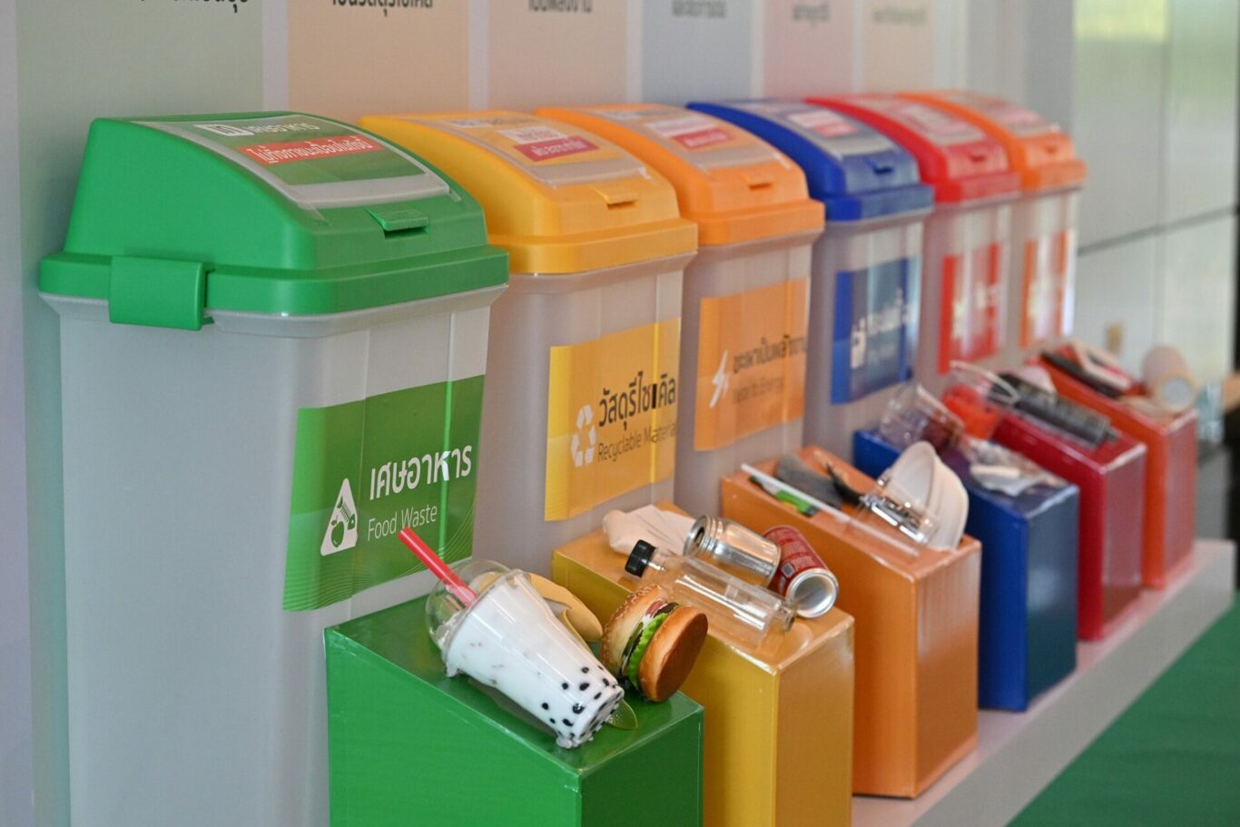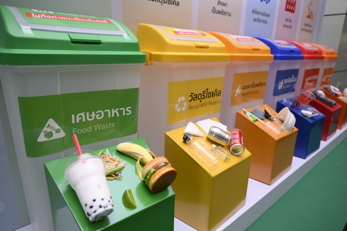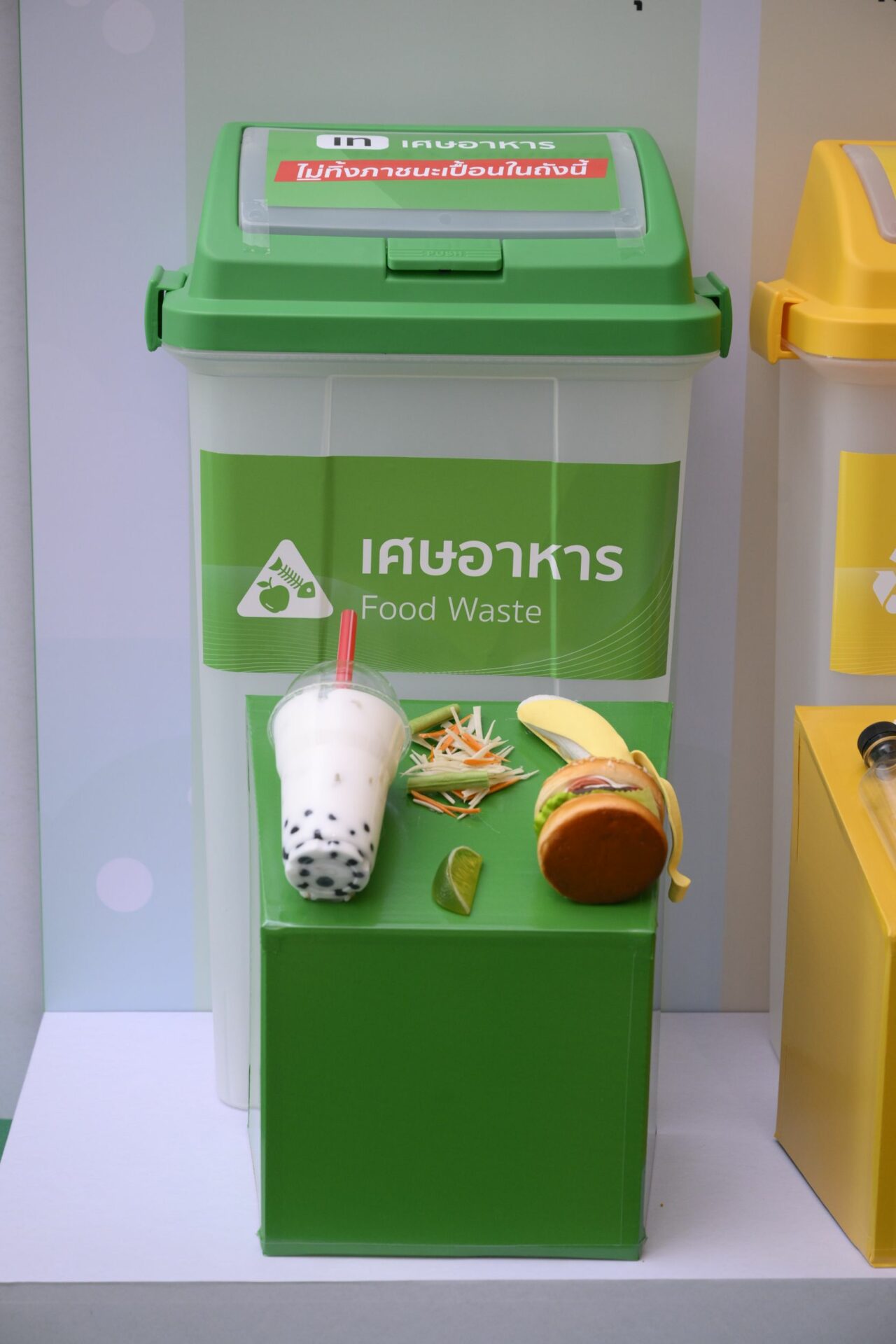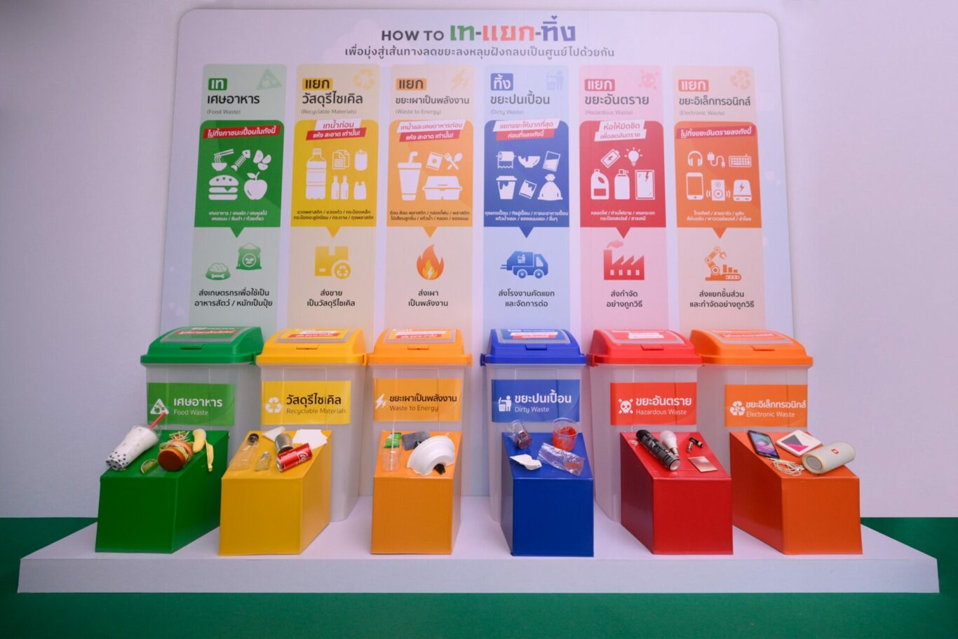 เพื่อขับเคลื่อนการจัดการขยะให้เกิดผลลัพธ์อย่างยั่งยืน ธนาคารได้ตั้งเป้าหมายการจัดการขยะในอาคารสำนักงานหลักไปสู่หลุมฝังกลบเป็นศูนย์ สำหรับ 4 อาคาร ภายในปี 2566 นี้ โดยเดินหน้าติดตั้งถังขยะ 6 ประเภท เพื่อคัดแยกขยะ 6 ชนิด ได้แก่ เศษอาหาร วัสดุรีไซเคิล ขยะเผาเป็นพลังงาน ขยะปนเปื้อน ขยะอันตราย และขยะอิเล็กทรอนิกส์ พร้อมกำหนดระบบการจัดการขยะของแต่ละถังอย่างมีประสิทธิภาพและเหมาะสมตามหลัก Zero Waste ตั้งแต่ต้นทางจนถึงปลายทางสุดท้าย เพื่อให้เหลือของเสียไปสู่หลุมฝังกลบน้อยลงและเป็นศูนย์ในที่สุด ควบคู่กับการให้ความรู้แก่พนักงานตระหนักถึงความสำคัญ มีความเข้าใจ และกระตุ้นให้เกิดการลงมือปฏิบัติจริง ผ่านแคมเปญสำหรับพนักงานในองค์กร “ทิ้งถูกไม่ถูกทิ้ง” ด้วย 3 ขั้นตอนง่าย ๆ “เท-แยก-ทิ้ง” โดยชวนพนักงานทั้งหมดมาเริ่มเปลี่ยนพฤติกรรมในการแยกขยะก่อนทิ้ง เน้นการให้ความรู้วิธีการแยกขยะและทิ้งให้ถูกถัง เพื่อให้ขยะไม่ถูกทิ้งอย่างไร้ค่า สามารถนำไปจัดการต่อได้อย่างมีประสิทธิภาพ พร้อมสร้างพฤติกรรมการทิ้งขยะให้ถูกต้อง