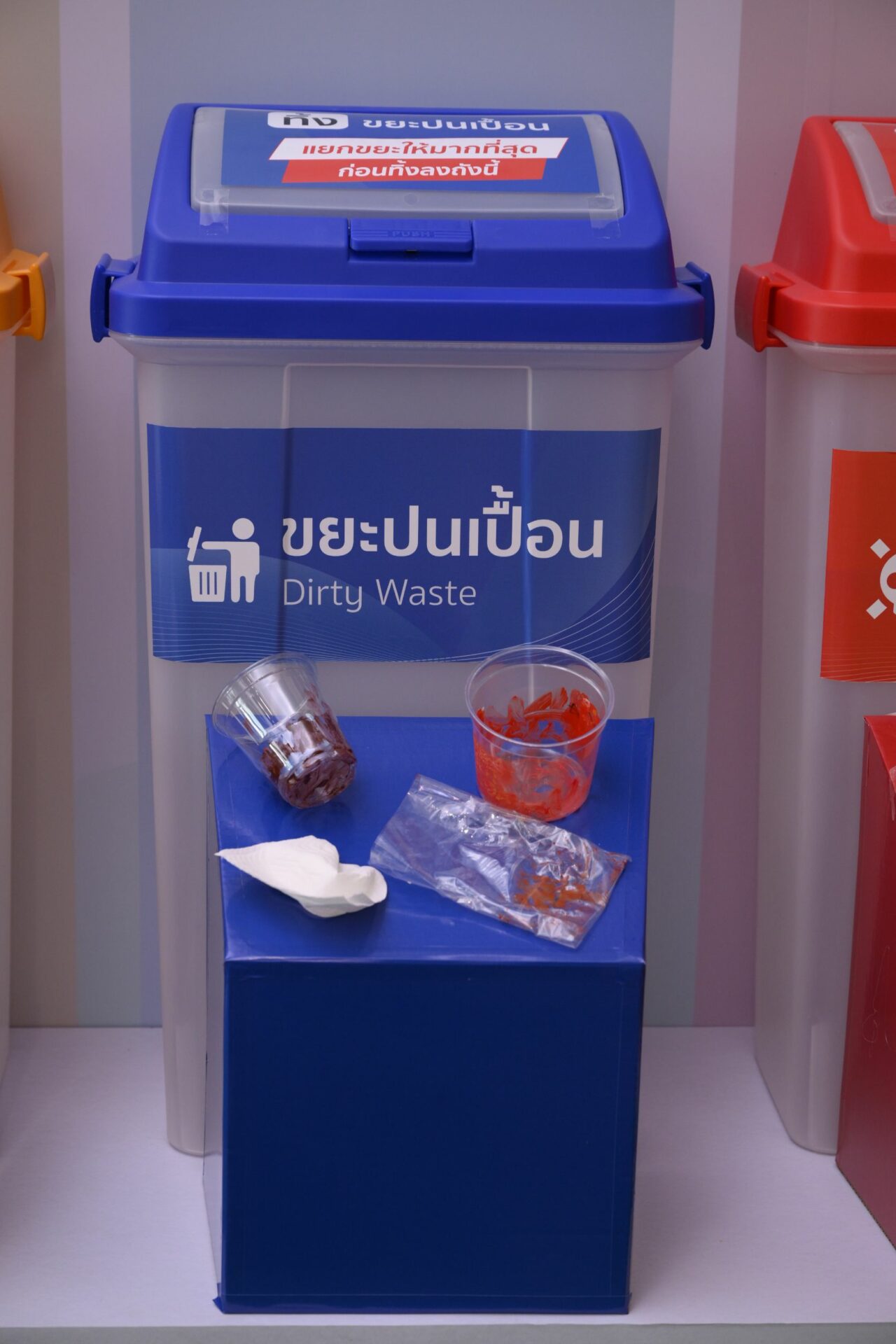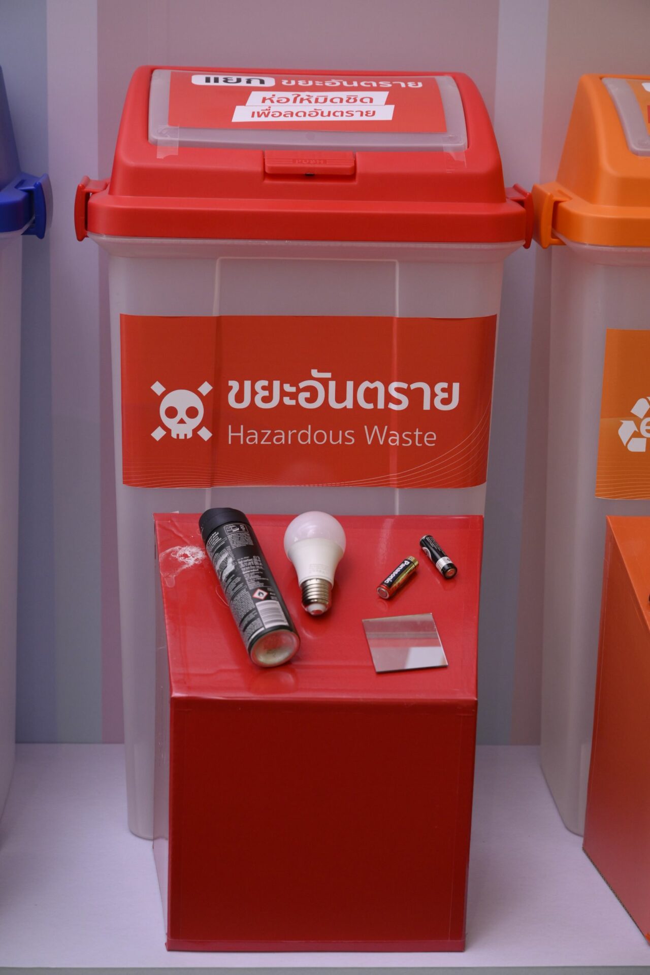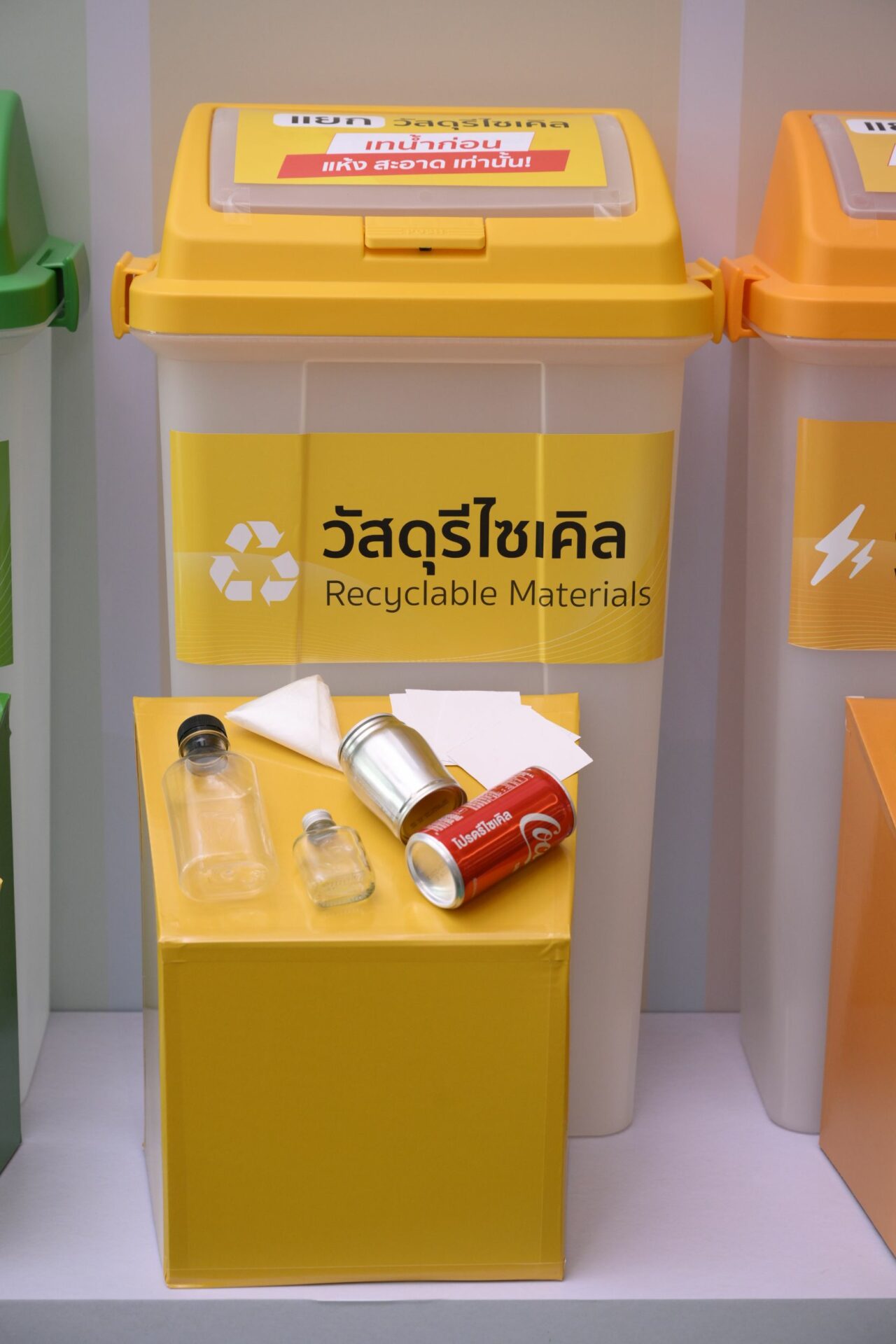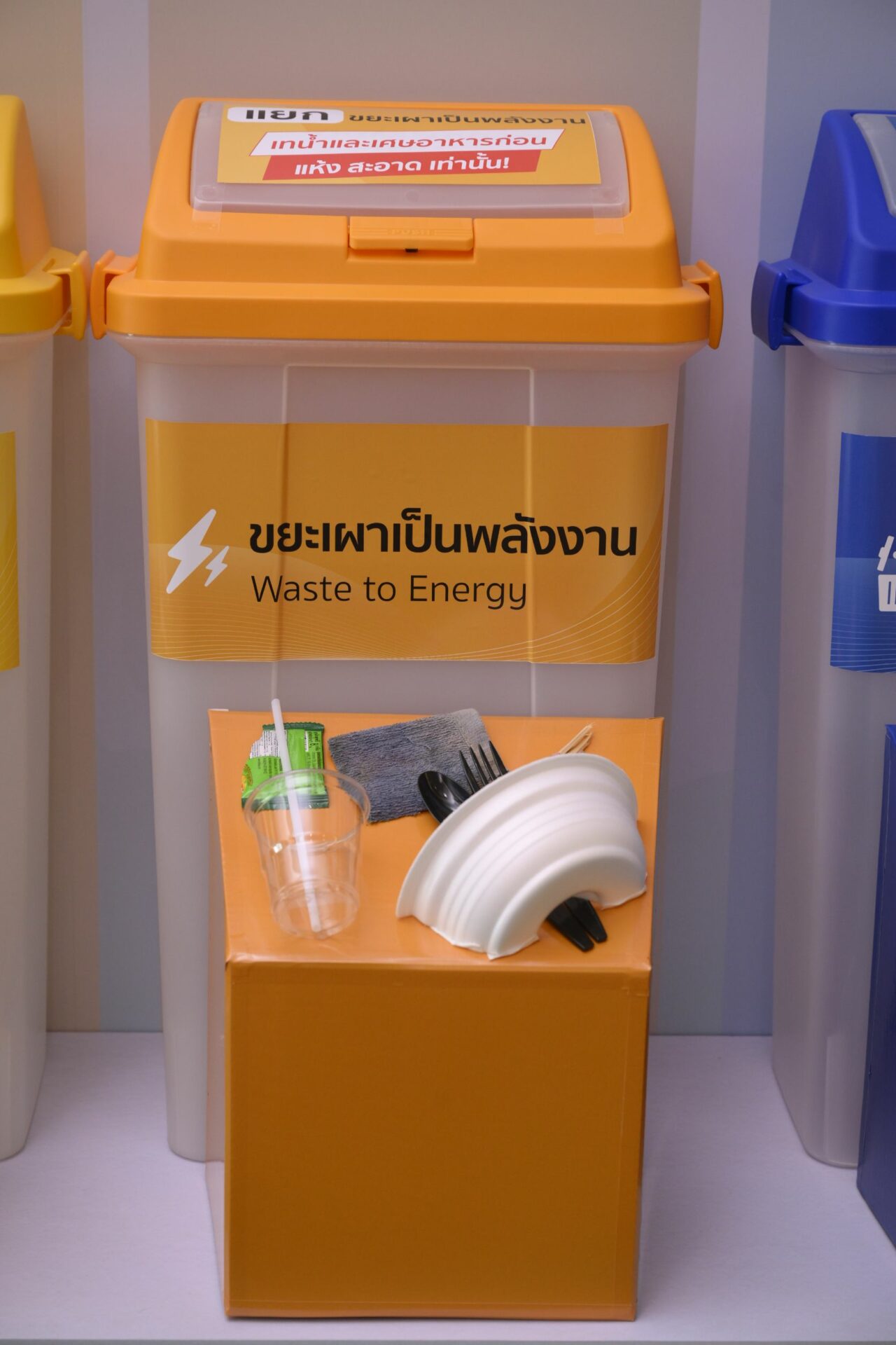 เพื่อขับเคลื่อนการจัดการขยะให้เกิดผลลัพธ์อย่างยั่งยืน ธนาคารได้ตั้งเป้าหมายการจัดการขยะในอาคารสำนักงานหลักไปสู่หลุมฝังกลบเป็นศูนย์ สำหรับ 4 อาคาร ภายในปี 2566 นี้ โดยเดินหน้าติดตั้งถังขยะ 6 ประเภท เพื่อคัดแยกขยะ 6 ชนิด ได้แก่ เศษอาหาร วัสดุรีไซเคิล ขยะเผาเป็นพลังงาน ขยะปนเปื้อน ขยะอันตราย และขยะอิเล็กทรอนิกส์ พร้อมกำหนดระบบการจัดการขยะของแต่ละถังอย่างมีประสิทธิภาพและเหมาะสมตามหลัก Zero Waste ตั้งแต่ต้นทางจนถึงปลายทางสุดท้าย เพื่อให้เหลือของเสียไปสู่หลุมฝังกลบน้อยลงและเป็นศูนย์ในที่สุด ควบคู่กับการให้ความรู้แก่พนักงานตระหนักถึงความสำคัญ มีความเข้าใจ และกระตุ้นให้เกิดการลงมือปฏิบัติจริง ผ่านแคมเปญสำหรับพนักงานในองค์กร “ทิ้งถูกไม่ถูกทิ้ง” ด้วย 3 ขั้นตอนง่าย ๆ “เท-แยก-ทิ้ง” โดยชวนพนักงานทั้งหมดมาเริ่มเปลี่ยนพฤติกรรมในการแยกขยะก่อนทิ้ง เน้นการให้ความรู้วิธีการแยกขยะและทิ้งให้ถูกถัง เพื่อให้ขยะไม่ถูกทิ้งอย่างไร้ค่า สามารถนำไปจัดการต่อได้อย่างมีประสิทธิภาพ พร้อมสร้างพฤติกรรมการทิ้งขยะให้ถูกต้อง