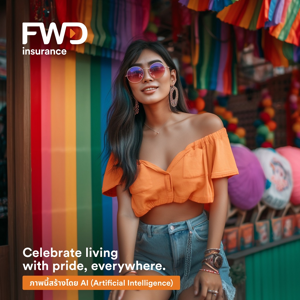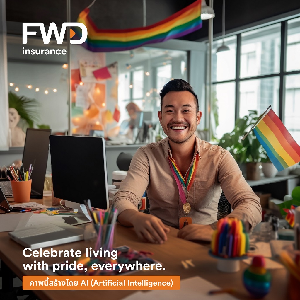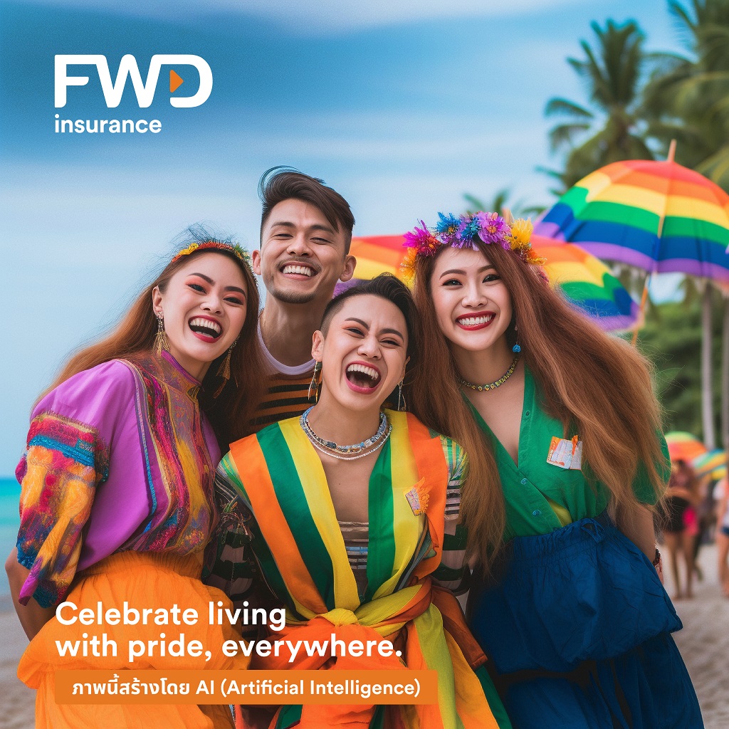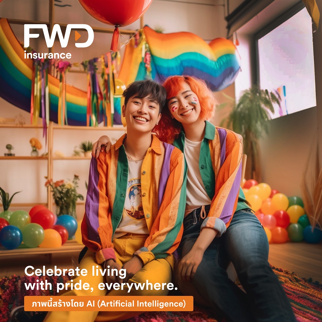 FWD ประกันชีวิต สร้างสรรค์การสื่อสารแบรนด์ด้วยความแตกต่างอย่างต่อเนื่อง ใช้เทคโนโลยี AI เป็นเจ้าแรกของวงการประกันชีวิต ต่อยอดกับแคมเปญ Celebrate living with Pride, everywhere ร่วมฉลอง Pride Month สร้างคอนเทนต์ซีรีส์ ไม่ว่าจะอยู่ที่ไหนในไทย ก็จัดงานฉลอง Celebrate Pride Month ได้ทุกที่ โดยมี FWD ประกันชีวิต สนับสนุนให้ทุกคนใช้ชีวิตได้ในแบบที่ต้องการ