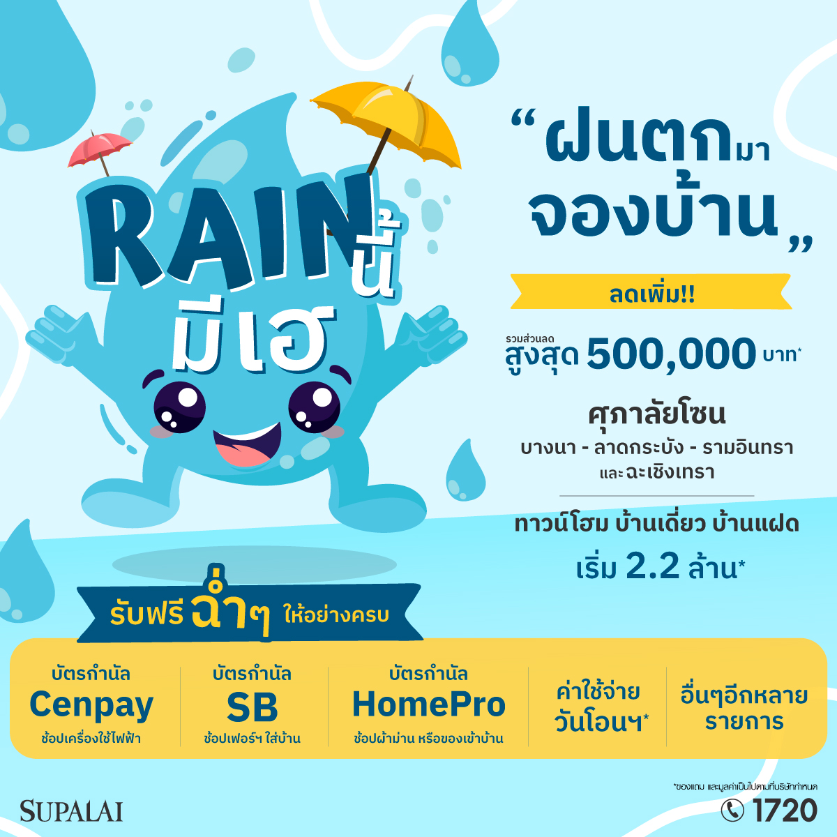 บริษัท ศุภาลัย จำกัด (มหาชน) เสิร์ฟโปรฯแรงส์ ชุ่มฉ่ำรับหน้าฝน “ศุภาลัย Rain นี้…มีเฮ” รับฟรีฉ่ำๆ ให้อย่างเยอะทั้งส่วนลดและของแถมสูงสุด 500,000 บาท เมื่อจองบ้านในโครงการโซนบางนา – ลาดกระบัง – รามอินทรา – ฉะเชิงเทรา ราคาเริ่มเพียง 2.2 ล้านบาท ช้อปกระหน่ำไม่กลัวฝนตั้งแต่วันที่ 1 ก.ค. – 31 ส.ค. นี้ หน้าฝนดี๊ดี ช้อปกระหน่ำท้าลมฝน ชวนลูกค้าที่กำลังมองหาบ้านมาเปิดประสบการณ์ใหม่ในโครงการศุภาลัย โซนบางนา – ลาดกระบัง – รามอินทรา – ฉะเชิงเทรา ให้ได้จับจองบ้านพร้อมโอนฯ และบ้านผ่อนดาวน์ ทุกแบบบ้าน ทั้งบ้านเดี่ยว บ้านแฝด และทาวน์โฮม