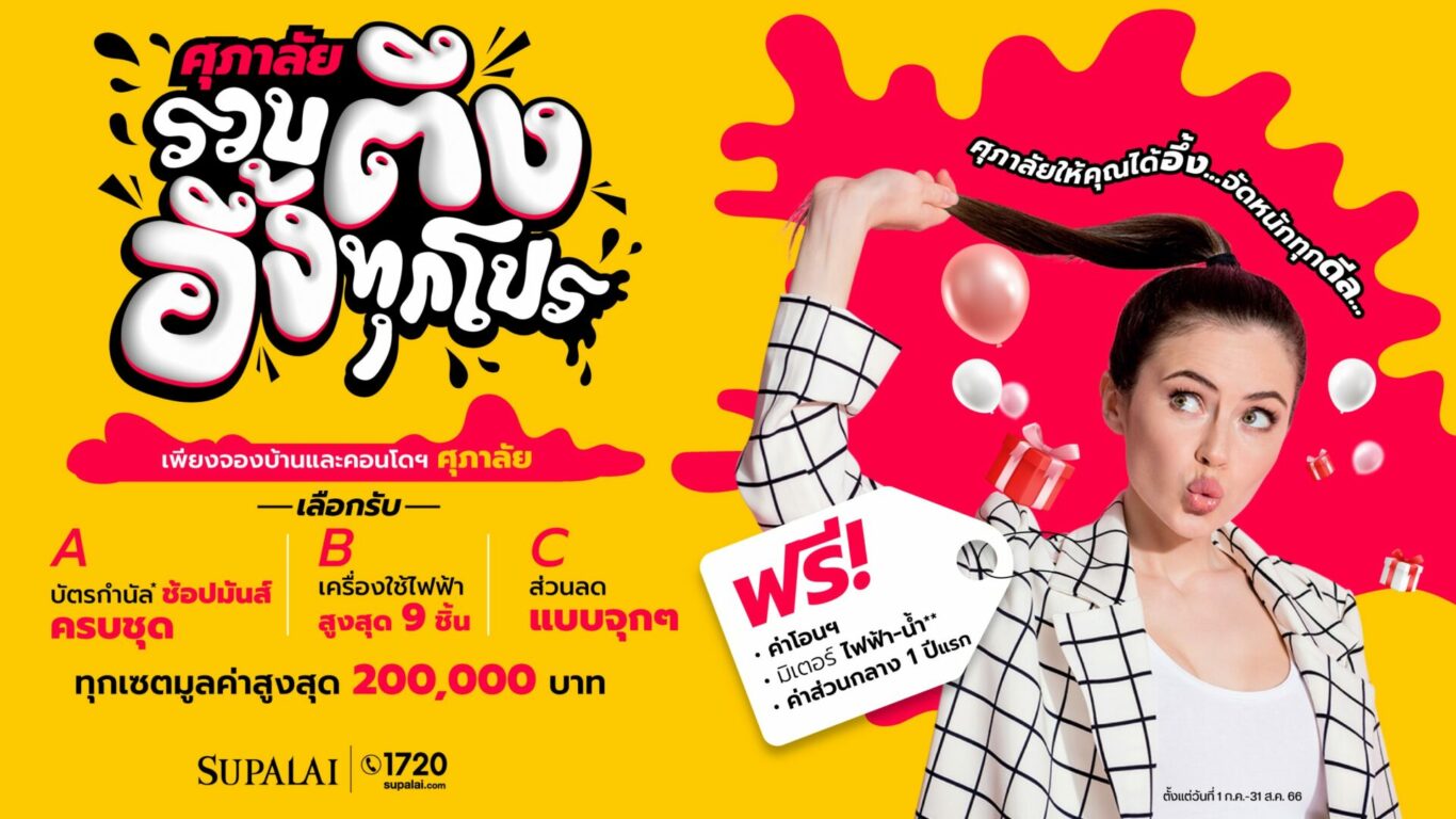 ศุภาลัย พร้อมปล่อยโปรฯ “รวบตึง! อึ้งทุกโปร” รวบทุกข้อเสนอชวนอึ้ง เอาใจคนอยากช้อปบ้านเดี่ยว บ้านแฝด ทาวน์โฮม และคอนโดฯ สร้างเสร็จพร้อมเข้าอยู่ในราคาสุดคุ้ม ไม่จองตอนโปรฯ นี้ จะให้ไปจองตอนโปรฯ ไหน พร้อมอึ้ง…กับโปรรวบตึงทุกของแถม ให้คุณเลือกได้ตามใจ Choice A บัตรกำนัลช้อปมันส์ มูลค่าสูงสุดถึง 200,000 บาท* Choice B เครื่องใช้ไฟฟ้าจาก SAMSUNG สูงสุด 9 ชิ้น* Choice C ส่วนลดสำหรับลูกค้าสูงสุดถึง 200,000 บาท* (เงื่อนไขเป็นไปตามที่บริษัทฯ กำหนด) ยังไม่หมด…รวบตึง! อึ้งได้อีก ฟรี ! ค่าธรรมเนียมโอนกรรมสิทธิ์, ค่ามิเตอร์น้ำ ค่ามิเตอร์ไฟ, ค่าส่วนกลาง 1 ปีแรก และหากลูกค้า กู้ไม่ผ่านพร้อมยินดีคืนเงิน เตรียมช้อปสนุกกับส่วนลดสนั่น “รวบตึง! อึ้งทุกโปร” ได้ตั้งแต่วันที่ 1 กรกฎาคม – 30 สิงหาคมนี้